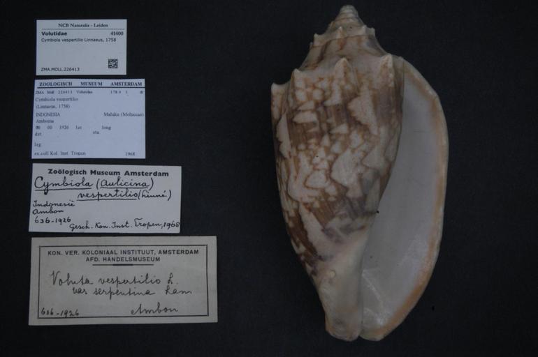 Keywords: Naturalis Biodiversity Center - ZMA.MOLL.226413 - Cymbiola vespertilio Linnaeus, 1758 - Volutidae - Mollusc shell.jpeg artwork Dimensions artwork Document type Volutidae Cymbiola Individual count Infraspecific epithet Infraspecific rank Institution Naturalis Kind of unit artwork Kind of unit specimen shell Life stage Medium artwork Nomenclatural code Scale the width of the text on the species/QR-code label is 38 mm Occurrence ID page Neogastropoda Other fields Other versions artwork Permission license Naturalis donation CC-0 Mollusca Publication location Scientific name Cymbiola vespertilio Linnaeus 1758 Scientific name authorship Linnaeus 1758 Source url http //bioportal naturalis nl Specific epithet vespertilio State or province Subject keywords artwork Subject keywords publication Title artwork Title publication Type status Uploaded with GWToolset Naturalis_Biodiversity_Center_-_ZMA MOLL 226413_-_Cymbiola_vespertilio_Linnaeus _1758_-_Volutidae_-_Mollusc_shell http //medialib naturalis nl/file/id/ZMA MOLL 226413/format/large Media donated by Naturalis Biodiversity Center Molluscs at Naturalis from the Zoölogisch Museum Amsterdam Cymbiola vespertilio Cymbiola |