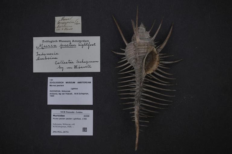Keywords: Naturalis Biodiversity Center - ZMA.MOLL.26751 - Murex pecten pecten Lightfoot, 1786 - Muricidae - Mollusc shell.jpeg artwork Dimensions artwork Document type Muricidae subfamily Muricinae Murex Individual count Infraspecific epithet pecten Infraspecific rank Institution Naturalis Kind of unit artwork Kind of unit specimen shell Life stage Indonesia; Moluccas coll M M Schepman 1920 Medium artwork Nomenclatural code Scale the width of the text on the species/QR-code label is 38 mm Occurrence ID page Neogastropoda Other fields Other versions artwork Permission license Naturalis donation CC-0 Mollusca Publication location Scientific name Murex pecten pecten Lightfoot 1786 Scientific name authorship Lightfoot 1786 Source url http //bioportal naturalis nl Specific epithet pecten State or province Moluccas Subject keywords artwork Subject keywords publication Title artwork Title publication Type status Uploaded with GWToolset Naturalis_Biodiversity_Center_-_ZMA MOLL 26751_-_Murex_pecten_pecten_Lightfoot _1786_-_Muricidae_-_Mollusc_shell http //medialib naturalis nl/file/id/ZMA MOLL 26751/format/large Media donated by Naturalis Biodiversity Center Molluscs at Naturalis from the Zoölogisch Museum Amsterdam Murex pecten |