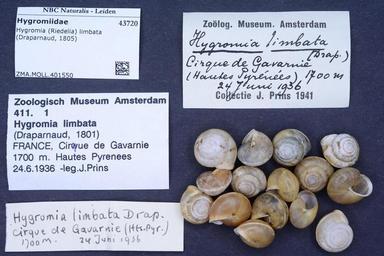 | Keywords: Naturalis Biodiversity Center - ZMA.MOLL.401550 - Hygromia (Riedelia) limbata (Draparnaud, 1805) - Hygromiidae - Mollusc shell.jpeg artwork Dimensions artwork Document type Hygromiidae subfamily Hygromiinae Hygromia Individual count Infraspecific epithet Infraspecific rank Institution Naturalis Kind of unit artwork Kind of unit specimen shell Life stage Medium artwork Nomenclatural code Source institute Rijksmuseum van Natuurlijke Historie Leiden Scale the width of the text on the species/QR-code label is 38 mm Occurrence ID page Other fields Other versions artwork Permission license Naturalis donation CC-0 Mollusca Publication location Scientific name Hygromia Riedelia limbata Draparnaud 1805 Scientific name authorship Draparnaud 1805 Source url http //bioportal naturalis nl Specific epithet limbata State or province Subject keywords artwork Subject keywords publication Title artwork Title publication Type status Uploaded with GWToolset Naturalis_Biodiversity_Center_-_ZMA MOLL 401550_-_Hygromia_ Riedelia _limbata_ Draparnaud _1805 _-_Hygromiidae_-_Mollusc_shell http //medialib naturalis nl/file/id/ZMA MOLL 401550/format/large Molluscs at Naturalis from the Zoölogisch Museum Amsterdam Media donated by Naturalis Biodiversity Center Hygromia limbata Hygromia |