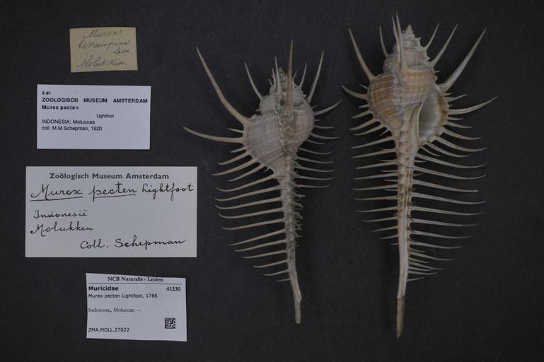 Keywords: Naturalis Biodiversity Center - ZMA.MOLL.27022 - Murex pecten pecten Lightfoot, 1786 - Muricidae - Mollusc shell.jpeg artwork Dimensions artwork Document type Muricidae subfamily Muricinae Murex Individual count Infraspecific epithet pecten Infraspecific rank Institution Naturalis Kind of unit artwork Kind of unit specimen shell Life stage Indonesia; Moluccas Medium artwork Nomenclatural code Scale the width of the text on the species/QR-code label is 38 mm Occurrence ID page Neogastropoda Other fields Other versions artwork Permission license Naturalis donation CC-0 Mollusca Publication location Scientific name Murex pecten pecten Lightfoot 1786 Scientific name authorship Lightfoot 1786 Source url http //bioportal naturalis nl Specific epithet pecten State or province Moluccas Subject keywords artwork Subject keywords publication Title artwork Title publication Type status Uploaded with GWToolset Naturalis_Biodiversity_Center_-_ZMA MOLL 27022_-_Murex_pecten_pecten_Lightfoot _1786_-_Muricidae_-_Mollusc_shell http //medialib naturalis nl/file/id/ZMA MOLL 27022/format/large Media donated by Naturalis Biodiversity Center Molluscs at Naturalis from the Zoölogisch Museum Amsterdam Murex pecten |
