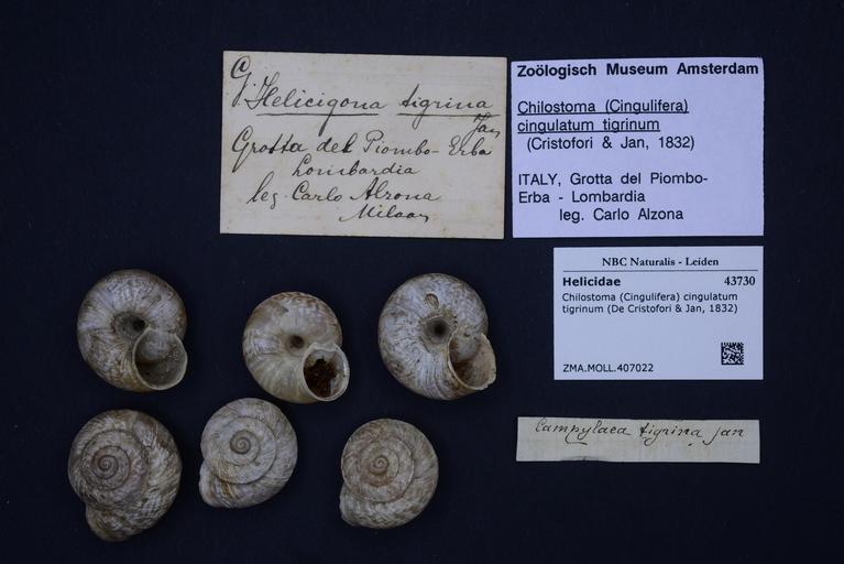| Keywords: Naturalis Biodiversity Center - ZMA.MOLL.407022 - Chilostoma (Cingulifera) cingulatum tigrinum (De Cristofori & Jan, 1832) - Helicidae - Mollusc shell.jpeg artwork Dimensions artwork Document type Helicidae subfamily Helicigoninae Chilostoma Individual count Infraspecific epithet tigrinum Infraspecific rank Institution Naturalis Kind of unit artwork Kind of unit specimen shell Life stage Medium artwork Nomenclatural code Source institute Zoölogisch Museum Amsterdam Scale the width of the text on the species/QR-code label is 38 mm Occurrence ID page Other fields Other versions artwork Permission license Naturalis donation CC-0 Mollusca Publication location Scientific name Chilostoma Cingulifera cingulatum tigrinum De Cristofori Jan 1832 Scientific name authorship De Cristofori Jan 1832 Source url http //bioportal naturalis nl Specific epithet cingulatum State or province Subject keywords artwork Subject keywords publication Title artwork Title publication Type status Uploaded with GWToolset Naturalis_Biodiversity_Center_-_ZMA MOLL 407022_-_Chilostoma_ Cingulifera _cingulatum_tigrinum_ De_Cristofori_ _Jan _1832 _-_Helicidae_-_Mollusc_shell http //medialib naturalis nl/file/id/ZMA MOLL 407022/format/large Molluscs at Naturalis from the Zoölogisch Museum Amsterdam Media donated by Naturalis Biodiversity Center Chilostoma cingulatum Chilostoma |