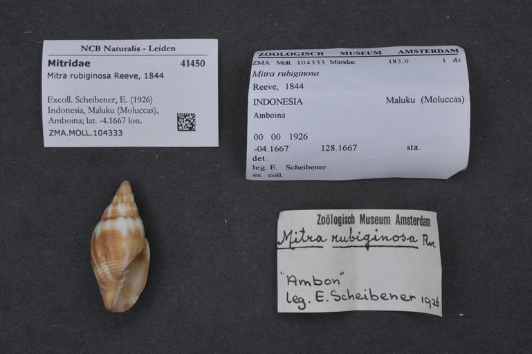 | Keywords: Naturalis Biodiversity Center - ZMA.MOLL.104333 - Mitra rubiginosa Reeve, 1844 - Mitridae - Mollusc shell.jpeg artwork Dimensions artwork Document type Mitridae subfamily Mitrinae Mitra Individual count Infraspecific epithet Infraspecific rank Institution Naturalis Kind of unit artwork Kind of unit specimen shell Life stage Indonesia Maluku Moluccas Amboina; lat -4 1667 lon 128 1667; 1926 Medium artwork Nomenclatural code Collection remarks Moll Scale the width of the text on the species/QR-code label is 38 mm Occurrence ID page Neogastropoda Other fields Other versions artwork Permission license Naturalis donation CC-0 Mollusca Publication location Scientific name Mitra rubiginosa Reeve 1844 Scientific name authorship Reeve 1844 Source url http //bioportal naturalis nl Specific epithet rubiginosa State or province Maluku Moluccas Subject keywords artwork Subject keywords publication Title artwork Title publication Type status Uploaded with GWToolset Naturalis_Biodiversity_Center_-_ZMA MOLL 104333_-_Mitra_rubiginosa_Reeve _1844_-_Mitridae_-_Mollusc_shell http //medialib naturalis nl/file/id/ZMA MOLL 104333/format/large Media donated by Naturalis Biodiversity Center Molluscs at Naturalis from the Zoölogisch Museum Amsterdam Mitra rubiginosa |