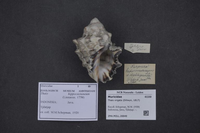 | Keywords: Naturalis Biodiversity Center - ZMA.MOLL.28849 - Thais virgata (Dillwyn, 1817) - Muricidae - Mollusc shell.jpeg artwork Dimensions artwork Document type Muricidae subfamily Rapaninae Thais Individual count Infraspecific epithet Infraspecific rank Institution Naturalis Kind of unit artwork Kind of unit specimen shell Life stage Indonesia; Jawa Tjilatjap Medium artwork Nomenclatural code Scale the width of the text on the species/QR-code label is 38 mm Occurrence ID page Neogastropoda Other fields Other versions artwork Permission license Naturalis donation CC-0 Mollusca Publication location Scientific name Thais virgata Dillwyn 1817 Scientific name authorship Dillwyn 1817 Source url http //bioportal naturalis nl Specific epithet virgata State or province Jawa Subject keywords artwork Subject keywords publication Title artwork Title publication Type status Uploaded with GWToolset Naturalis_Biodiversity_Center_-_ZMA MOLL 28849_-_Thais_virgata_ Dillwyn _1817 _-_Muricidae_-_Mollusc_shell http //medialib naturalis nl/file/id/ZMA MOLL 28849/format/large Media donated by Naturalis Biodiversity Center Molluscs at Naturalis from the Zoölogisch Museum Amsterdam Thais virgata |