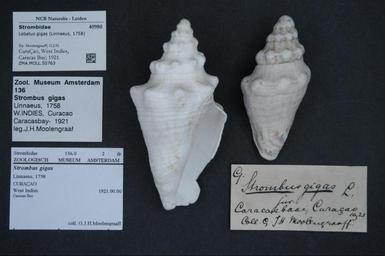 Keywords: Naturalis Biodiversity Center - ZMA.MOLL.50763 - Lobatus gigas (Linnaeus, 1758) - Strombidae - Mollusc shell.jpeg artwork Dimensions artwork Document type Strombidae Lobatus Individual count Infraspecific epithet Infraspecific rank Institution Naturalis Kind of unit artwork Kind of unit specimen shell Life stage Curaçao West Indies Caracas Bay; 1921 Medium artwork Nomenclatural code Source institute Zoölogisch Museum Amsterdam Scale the width of the text on the species/QR-code label is 38 mm Occurrence ID page Other fields Other versions artwork Permission license Naturalis donation CC-0 Mollusca Publication location Scientific name Lobatus gigas Linnaeus 1758 Scientific name authorship Linnaeus 1758 Source url http //bioportal naturalis nl Specific epithet gigas State or province Curaçao Subject keywords artwork Subject keywords publication Title artwork Title publication Type status Uploaded with GWToolset Naturalis_Biodiversity_Center_-_ZMA MOLL 50763_-_Lobatus_gigas_ Linnaeus _1758 _-_Strombidae_-_Mollusc_shell http //medialib naturalis nl/file/id/ZMA MOLL 50763/format/large Molluscs at Naturalis from the Zoölogisch Museum Amsterdam Media donated by Naturalis Biodiversity Center Eustrombus gigas Lobatus |