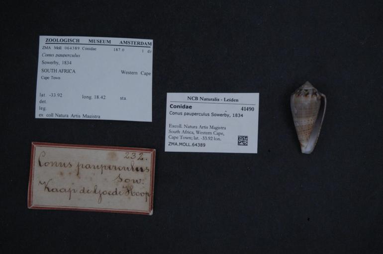 Keywords: Naturalis Biodiversity Center - ZMA.MOLL.64389 - Conus pauperculus Sowerby, 1834 - Conidae - Mollusc shell.jpeg artwork Dimensions artwork Document type Conidae Conus Individual count Infraspecific epithet Infraspecific rank Institution Naturalis Kind of unit artwork Kind of unit specimen shell Life stage South Africa Western Cape Cape Town; lat -33 92 lon 18 42 Medium artwork Nomenclatural code Source institute Zoölogisch Museum Amsterdam Scale the width of the text on the species/QR-code label is 38 mm Occurrence ID page Other fields Other versions artwork Permission license Naturalis donation CC-0 Mollusca Publication location Scientific name Conus pauperculus Sowerby 1834 Scientific name authorship Sowerby 1834 Source url http //bioportal naturalis nl Specific epithet pauperculus State or province Western Cape Subject keywords artwork Subject keywords publication Title artwork Title publication Type status Uploaded with GWToolset Naturalis_Biodiversity_Center_-_ZMA MOLL 64389_-_Conus_pauperculus_Sowerby _1834_-_Conidae_-_Mollusc_shell http //medialib naturalis nl/file/id/ZMA MOLL 64389/format/large Molluscs at Naturalis from the Zoölogisch Museum Amsterdam Media donated by Naturalis Biodiversity Center Conus pauperculus Conus |