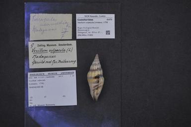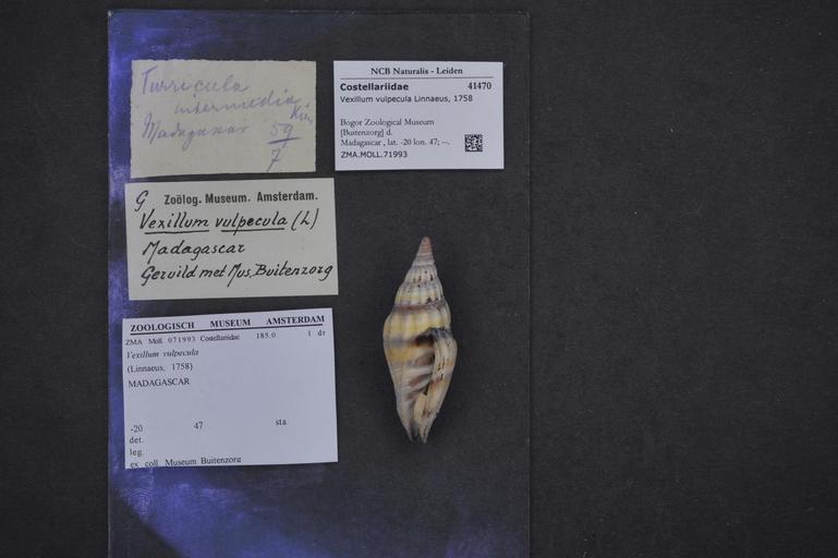 Keywords: Naturalis Biodiversity Center - ZMA.MOLL.71993 - Vexillum vulpecula (Linnaeus, 1758) - Costellariidae - Mollusc shell.jpeg artwork Dimensions artwork Document type Costellariidae Vexillum Individual count Infraspecific epithet Infraspecific rank Institution Naturalis Kind of unit artwork Kind of unit specimen shell Life stage Madagascar lat -20 lon 47 Medium artwork Nomenclatural code Collection remarks Moll Source institute Zoölogisch Museum Amsterdam Scale the width of the text on the species/QR-code label is 38 mm Occurrence ID page Neogastropoda Other fields Other versions artwork Permission license Naturalis donation CC-0 Mollusca Publication location Scientific name Vexillum vulpecula Linnaeus 1758 Scientific name authorship Linnaeus 1758 Source url http //bioportal naturalis nl Specific epithet vulpecula State or province Subject keywords artwork Subject keywords publication Title artwork Title publication Type status Uploaded with GWToolset Naturalis_Biodiversity_Center_-_ZMA MOLL 71993_-_Vexillum_vulpecula_ Linnaeus _1758 _-_Costellariidae_-_Mollusc_shell http //medialib naturalis nl/file/id/ZMA MOLL 71993/format/large Molluscs at Naturalis from the Zoölogisch Museum Amsterdam Media donated by Naturalis Biodiversity Center Vexillum vulpecula Vexillum |