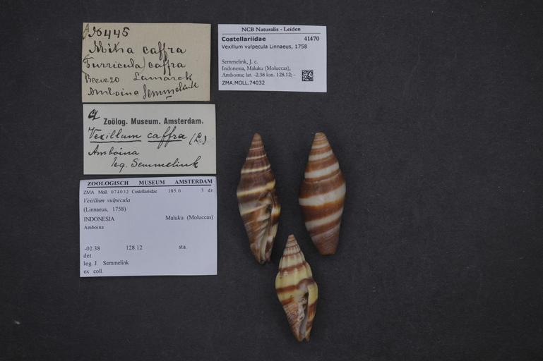 Keywords: Naturalis Biodiversity Center - ZMA.MOLL.74032 - Vexillum vulpecula (Linnaeus, 1758) - Costellariidae - Mollusc shell.jpeg artwork Dimensions artwork Document type Costellariidae Vexillum Individual count Infraspecific epithet Infraspecific rank Institution Naturalis Kind of unit artwork Kind of unit specimen shell Life stage Indonesia Maluku Moluccas Amboina; lat -2 38 lon 128 12 Medium artwork Nomenclatural code Collection remarks Moll Source institute Zoölogisch Museum Amsterdam Scale the width of the text on the species/QR-code label is 38 mm Occurrence ID page Neogastropoda Other fields Other versions artwork Permission license Naturalis donation CC-0 Mollusca Publication location Scientific name Vexillum vulpecula Linnaeus 1758 Scientific name authorship Linnaeus 1758 Source url http //bioportal naturalis nl Specific epithet vulpecula State or province Maluku Moluccas Subject keywords artwork Subject keywords publication Title artwork Title publication Type status Uploaded with GWToolset Naturalis_Biodiversity_Center_-_ZMA MOLL 74032_-_Vexillum_vulpecula_ Linnaeus _1758 _-_Costellariidae_-_Mollusc_shell http //medialib naturalis nl/file/id/ZMA MOLL 74032/format/large Molluscs at Naturalis from the Zoölogisch Museum Amsterdam Media donated by Naturalis Biodiversity Center Vexillum vulpecula Vexillum |