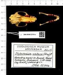 Keywords: Naturalis Biodiversity Center - ZMA.MAM.22704.a pal - Styloctenium wallacei - skull.jpeg artwork Dimensions artwork Document type Styloctenium Individual count Infraspecific epithet Infraspecific rank Institution Naturalis Kind of unit artwork Kind of unit specimen skull Life stage Gekocht op markt te Imandi Noord-Sulawesi Indonesia Medium artwork Nomenclatural code Occurrence ID page Other fields Other versions artwork Permission license Naturalis donation CC-0 Publication location Scientific name Styloctenium wallacei Scientific name authorship male Source url http //bioportal naturalis nl Specific epithet wallacei State or province Subject keywords artwork Subject keywords publication Title artwork Title publication Type status Uploaded with GWToolset Naturalis_Biodiversity_Center_-_ZMA MAM 22704 a_pal_-_Styloctenium_wallacei_-_skull http //medialib naturalis nl/file/id/ZMA MAM 22704 a_pal/format/large Mammals at Naturalis from the Zoölogisch Museum Amsterdam Media donated by Naturalis Biodiversity Center Styloctenium wallacei Styloctenium |