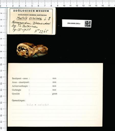 Keywords: Naturalis Biodiversity Center - ZMA.MAM.2265.a lat 2 - Mustela erminea Linnaeus - skull.jpeg artwork Dimensions artwork Document type Mustela Individual count 1 Infraspecific epithet Infraspecific rank Institution Naturalis Kind of unit artwork Kind of unit specimen skull Life stage Netherlands Noord Holland Kennemerduinen Medium artwork Nomenclatural code Occurrence ID page Other fields Other versions artwork Permission license Naturalis donation CC-0 Publication location Scientific name Mustela erminea Linnaeus Scientific name authorship Linnaeus male Source url http //bioportal naturalis nl Specific epithet erminea State or province Noord Holland Subject keywords artwork Subject keywords publication Title artwork Title publication Type status Uploaded with GWToolset Naturalis_Biodiversity_Center_-_ZMA MAM 2265 a_lat_2_-_Mustela_erminea_Linnaeus_-_skull http //medialib naturalis nl/file/id/ZMA MAM 2265 a_lat_2/format/large Mammals at Naturalis from the Zoölogisch Museum Amsterdam Media donated by Naturalis Biodiversity Center Mustela erminea Mustela |