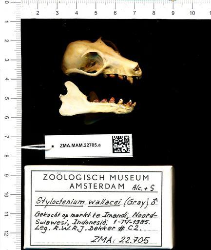 Keywords: Naturalis Biodiversity Center - ZMA.MAM.22705.a lat - Styloctenium wallacei - skull.jpeg artwork Dimensions artwork Document type Styloctenium Individual count Infraspecific epithet Infraspecific rank Institution Naturalis Kind of unit artwork Kind of unit specimen skull Life stage Gekocht op markt te Imandi Noord-Sulawesi Indonesia Medium artwork Nomenclatural code Occurrence ID page Other fields Other versions artwork Permission license Naturalis donation CC-0 Publication location Scientific name Styloctenium wallacei Scientific name authorship male Source url http //bioportal naturalis nl Specific epithet wallacei State or province Subject keywords artwork Subject keywords publication Title artwork Title publication Type status Uploaded with GWToolset Naturalis_Biodiversity_Center_-_ZMA MAM 22705 a_lat_-_Styloctenium_wallacei_-_skull http //medialib naturalis nl/file/id/ZMA MAM 22705 a_lat/format/large Mammals at Naturalis from the Zoölogisch Museum Amsterdam Media donated by Naturalis Biodiversity Center Styloctenium wallacei Styloctenium |