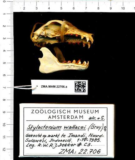 Keywords: Naturalis Biodiversity Center - ZMA.MAM.22706.a lat - Styloctenium wallacei - skull.jpeg artwork Dimensions artwork Document type Styloctenium Individual count Infraspecific epithet Infraspecific rank Institution Naturalis Kind of unit artwork Kind of unit specimen skull Life stage Gekocht op markt te Imandi Noord-Sulawesi Indonesia Medium artwork Nomenclatural code Occurrence ID page Other fields Other versions artwork Permission license Naturalis donation CC-0 Publication location Scientific name Styloctenium wallacei Scientific name authorship female Source url http //bioportal naturalis nl Specific epithet wallacei State or province Subject keywords artwork Subject keywords publication Title artwork Title publication Type status Uploaded with GWToolset Naturalis_Biodiversity_Center_-_ZMA MAM 22706 a_lat_-_Styloctenium_wallacei_-_skull http //medialib naturalis nl/file/id/ZMA MAM 22706 a_lat/format/large Mammals at Naturalis from the Zoölogisch Museum Amsterdam Media donated by Naturalis Biodiversity Center Styloctenium wallacei Styloctenium |