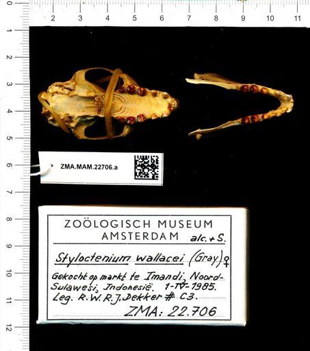 Keywords: Naturalis Biodiversity Center - ZMA.MAM.22706.a pal - Styloctenium wallacei - skull.jpeg artwork Dimensions artwork Document type Styloctenium Individual count Infraspecific epithet Infraspecific rank Institution Naturalis Kind of unit artwork Kind of unit specimen skull Life stage Gekocht op markt te Imandi Noord-Sulawesi Indonesia Medium artwork Nomenclatural code Occurrence ID page Other fields Other versions artwork Permission license Naturalis donation CC-0 Publication location Scientific name Styloctenium wallacei Scientific name authorship female Source url http //bioportal naturalis nl Specific epithet wallacei State or province Subject keywords artwork Subject keywords publication Title artwork Title publication Type status Uploaded with GWToolset Naturalis_Biodiversity_Center_-_ZMA MAM 22706 a_pal_-_Styloctenium_wallacei_-_skull http //medialib naturalis nl/file/id/ZMA MAM 22706 a_pal/format/large Mammals at Naturalis from the Zoölogisch Museum Amsterdam Media donated by Naturalis Biodiversity Center Styloctenium wallacei Styloctenium |