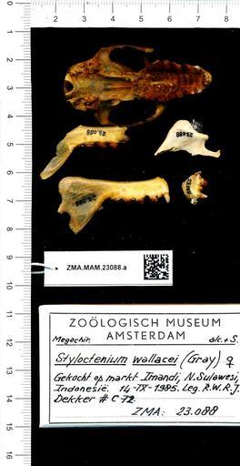 Keywords: Naturalis Biodiversity Center - ZMA.MAM.23088.a pal - Styloctenium wallacei Gray - skull.jpeg artwork Dimensions artwork Document type Styloctenium Individual count Infraspecific epithet Infraspecific rank Institution Naturalis Kind of unit artwork Kind of unit specimen skull Life stage Gekocht op markt Imandi N Sulawesi Indonesia Medium artwork Nomenclatural code Occurrence ID page Other fields Other versions artwork Permission license Naturalis donation CC-0 Publication location Scientific name Styloctenium wallacei Gray Scientific name authorship Gray female Source url http //bioportal naturalis nl Specific epithet wallacei State or province Subject keywords artwork Subject keywords publication Title artwork Title publication Type status Uploaded with GWToolset Naturalis_Biodiversity_Center_-_ZMA MAM 23088 a_pal_-_Styloctenium_wallacei_Gray_-_skull http //medialib naturalis nl/file/id/ZMA MAM 23088 a_pal/format/large Mammals at Naturalis from the Zoölogisch Museum Amsterdam Media donated by Naturalis Biodiversity Center Styloctenium wallacei Styloctenium |