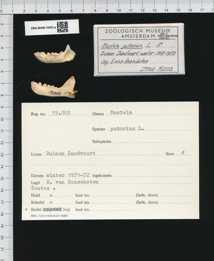 | Keywords: Naturalis Biodiversity Center - ZMA.MAM.15003.a gen - Mustela putorius Linnaeus - skull.jpeg artwork Dimensions artwork Document type Mustela Individual count 1 Infraspecific epithet Infraspecific rank Institution Naturalis Kind of unit artwork Kind of unit specimen skull Life stage Netherlands Noord Holland Zandvoort Medium artwork Nomenclatural code Occurrence ID page Other fields Other versions artwork Permission license Naturalis donation CC-0 Publication location Scientific name Mustela putorius Linnaeus Scientific name authorship Linnaeus male Source url http //bioportal naturalis nl Specific epithet putorius State or province Noord Holland Subject keywords artwork Subject keywords publication Title artwork Title publication Type status Uploaded with GWToolset Naturalis_Biodiversity_Center_-_ZMA MAM 15003 a_gen_-_Mustela_putorius_Linnaeus_-_skull http //medialib naturalis nl/file/id/ZMA MAM 15003 a_gen/format/large Mammals at Naturalis from the Zoölogisch Museum Amsterdam Media donated by Naturalis Biodiversity Center Mustela putorius Mustela |