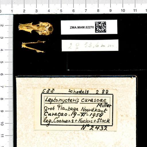 Keywords: Naturalis Biodiversity Center - ZMA.MAM.52270 pal - Leptonycteris curasoae - skull.jpeg artwork Dimensions artwork Document type Leptonycteris Individual count 1 Infraspecific epithet Infraspecific rank Institution Naturalis Kind of unit artwork Kind of unit specimen skull Life stage Grot Plantage Noordkant CuraƧao Medium artwork Nomenclatural code Occurrence ID page Other fields Other versions artwork Permission license Naturalis donation CC-0 Publication location Scientific name Leptonycteris curasoae Scientific name authorship female Source url http //bioportal naturalis nl Specific epithet curasoae State or province Subject keywords artwork Subject keywords publication Title artwork Title publication Type status Uploaded with GWToolset Naturalis_Biodiversity_Center_-_ZMA MAM 52270_pal_-_Leptonycteris_curasoae_-_skull http //medialib naturalis nl/file/id/ZMA MAM 52270_pal/format/large Mammals at Naturalis from the Zoƶlogisch Museum Amsterdam Media donated by Naturalis Biodiversity Center Leptonycteris curasoae Leptonycteris |