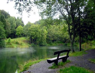 Keywords: nature lake bank hochrhoen rhön fog morning morgenstimmung trees hiking rest relaxation break away forest path autumn on the go