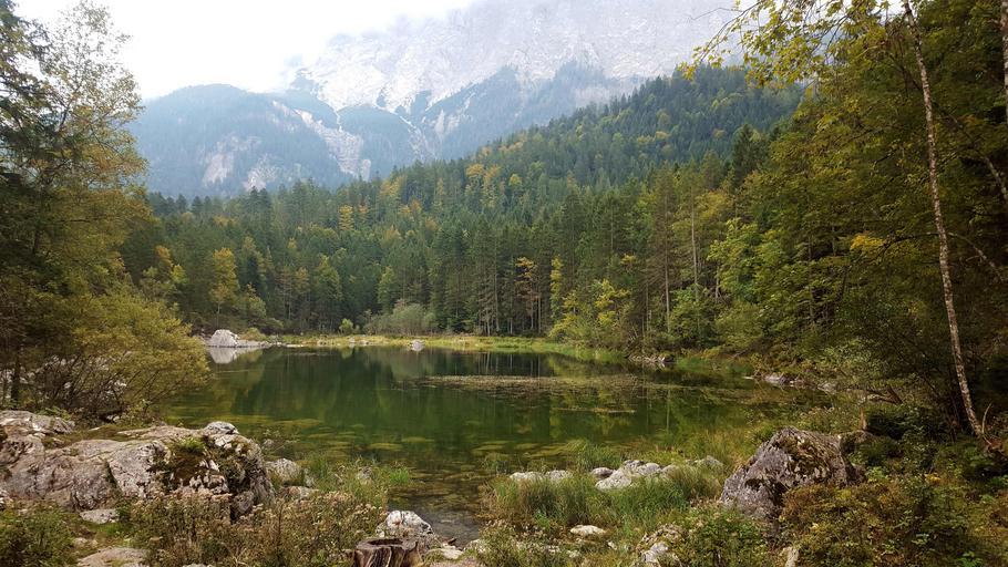 Keywords: nature view garmisch eibsee mountains landscape zugspitze height rock green allgäu stunning bergsee lake trees forest autumn fog
