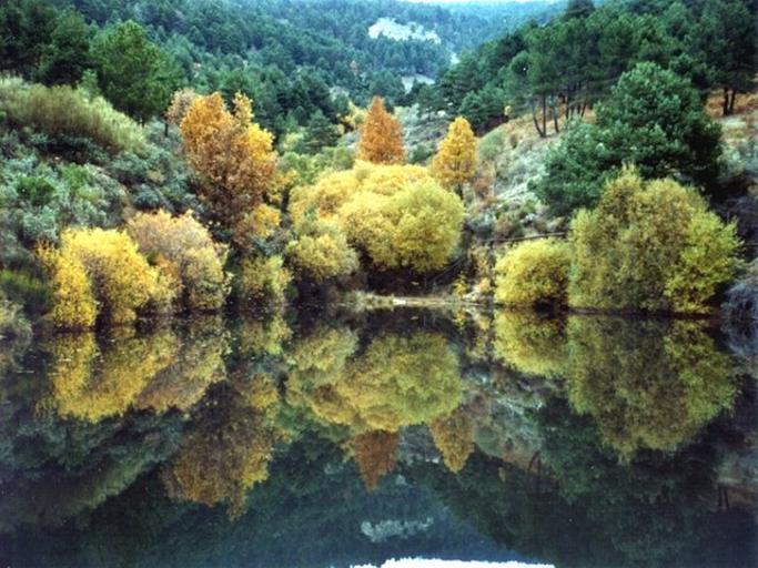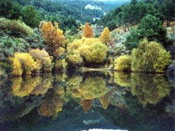 Keywords: Navacerrada chiquillo.jpg Vista otoñal del embalse de Chiquillo situado en la zona baja del valle de la Barranca en el término municipal del pueblo madrileño de Navacerrada España Este es uno de los numerosos pequeños embalses repartidos por la Sierra de Guadarrama que abastecen de agua a los núcleos urbanos situados más altos que los grandes embalses de la zona Estos almacenamientos de agua han dado lugar a una vegetación arbórea de ribera que crece en sus orillas Estos árboles son de hoja caduca y necesitan más agua que otras especies presentes en la sierra Al fondo de la imagen se aprecia parte del bosque de pino silvestre que cubre el valle de la Barranca 2006-04-17 own assumed Marmorlu Barranca valley Landscapes of the Community of Madrid Forests in Spain