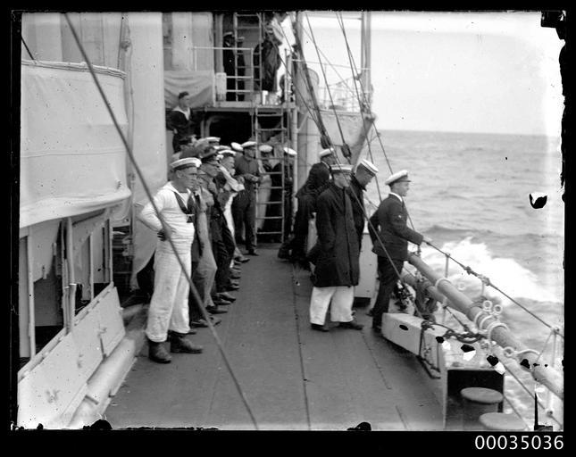 Keywords: hood collection hoodcollection 35036 samuel j hood collection samueljhoodcollection hmas torrens hmastorrens torrens royal australian navy royalaustraliannavy navy naval vessel navalvessel sinking scuttled scuttling 1930 destroyer sydney sydney heads sydneyheads naval personnel navalpersonnel naval officers navalofficers sailors hmas anzac hmasanzac blackandwhite monochrome photo border outdoor black and white Having served in the Royal Australian Navy from 1916, latterly as a training platform for the Naval Reserve, HMAS TORRENS I was decommissioned and prepared as a target for Fleet Gunnery Practice. On 24 November 1930 Samuel J Hood, who was probably on board HMAS ANZAC, photographed the sinking of TORRENS off Sydney Heads. Royal Australian Navy officers and sailors are depicted here, probably on board ANZAC, witnessing the sinking. This photo is part of the Australian National Maritime Museum’s Samuel J. Hood Studio collection. Sam Hood (1872-1953) was a Sydney photographer with a passion for ships. His 60-year career spanned the romantic age of sail and two world wars. The photos in the collection were taken mainly in Sydney and Newcastle during the first half of the 20th century. The ANMM undertakes research and accepts public comments that enhance the information we hold about images in our collection. This record has been updated accordingly. Photographer: Samuel J. Hood Studio Collection Object no. 00035036 Having served in the Royal Australian Navy from 1916, latterly as a training platform for the Naval Reserve, HMAS TORRENS I was decommissioned and prepared as a target for Fleet Gunnery Practice. On 24 November 1930 Samuel J Hood, who was probably on board HMAS ANZAC, photographed the sinking of TORRENS off Sydney Heads. Royal Australian Navy officers and sailors are depicted here, probably on board ANZAC, witnessing the sinking. This photo is part of the Australian National Maritime Museum’s Samuel J. Hood Studio collection. Sam Hood (1872-1953) was a Sydney photographer with a passion for ships. His 60-year career spanned the romantic age of sail and two world wars. The photos in the collection were taken mainly in Sydney and Newcastle during the first half of the 20th century. The ANMM undertakes research and accepts public comments that enhance the information we hold about images in our collection. This record has been updated accordingly. Photographer: Samuel J. Hood Studio Collection Object no. 00035036 |