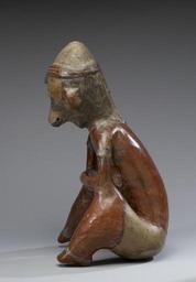 Keywords: Nayarit - Seated Male - Walters 20092061 - Left Side.jpg Lagunillas figures often portray men usually in a seated position with elbows resting on bent knees and forearms crossed on top of each other The torso leans forward and the face gazes downward This figure's loins are wrapped in a relatively wide hip cloth of unadorned fabric He wears a textile or plant fiber triple-strand band around his head a forelock of hair falling below the band His face is extensively painted with black designs including masklike half circles around his eyes and whisker-like motifs extending outward from the corners of his mouth Arm and ankle bands perhaps made of cut shell adorn his limbs; similar multi-stringed ornaments have been found adorning corporeal remains in many tombs from this region 300 BC-AD 200 burnished earthenware slip paint cm 46 2 27 2 35 4 accession number 2009 20 61 80216 Stendahl Galleries Los Angeles date and mode of acquisition unknown John G Bourne 1960s by purchase Walters Art Museum Gift of John Bourne 2009 place of origin Nayarit Mexico Walters Art Museum license Nayarit Pre-Columbian pottery in the Walters Art Museum Nayarit pottery Media contributed by the Walters Art Museum needs category review
