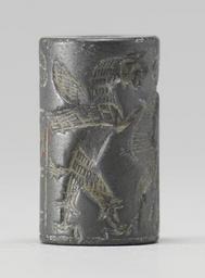 Keywords: Near Eastern - Cylinder Seal with Four Beasts in Combat - Walters 42814 - Side B.jpg The scene on this seal depicts a lion attacking a horned quadruped A second horned quadruped is shown being attacked by a winged monster with talons Between these two sets of battling creatures is a small juglet suspended in the field There is a cuneiform inscription in two registers and above the registers is a disk with a star in it cradled in an inverted crescent between 1970 1670 BC early Old Babylonian; Babylon I hematite cm 2 1 2 accession number 42 814 27892 Sadie Jones Mrs Henry Walters New York date and mode of acquisition unknown Sale Joseph Brummer New York 1941 Walters Art Museum 1941 by purchase Museum purchase 1941 Inscription place of origin Mesopotamia Walters Art Museum license Cylinder seals in the Walters Art Museum Art of the ancient Near East Media contributed by the Walters Art Museum needs category review |