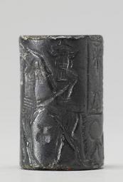 Keywords: Near Eastern - Cylinder Seal with Enkidu Vanquishing the Bull of Heaven - Walters 42786 - Side G.jpg At the center of the depicted scene is a handled jug on a stand Flanking this motif on both sides is an animal contest motif with a bearded hero/bull-man in horned headdress battling a bull-man At the edge of the scene is a cuneiform inscription in two registers at the top and beneath it is a small four legged animal with a long tail that curls upward between 1970 1670 BC early Old Babylonian; Babylon I hematite cm 2 3 1 4 accession number 42 786 3746 Sadie Jones Mrs Henry Walters New York date and mode of acquisition unknown Sale Joseph Brummer New York 1941 Walters Art Museum 1941 by purchase Museum purchase 1941 Inscription place of origin Mesopotamia Walters Art Museum license Cylinder seals in the Walters Art Museum Art of the ancient Near East Media contributed by the Walters Art Museum needs category review |