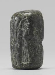 | Keywords: Near Eastern - Cylinder Seal with Man Standing with Two Animals - Walters 42634 - Side D.jpg Disproportionate to the point of being disfigured a standing figure in long robe cinched at waist feeds two animals which look like reindeer-giraffe hybrids beneath a sun with rays emanating from it The scene also includes three registers of cuneiform date black stone cm 1 3 diam accession number 42 634 19536 Sadie Jones Mrs Henry Walters New York date and mode of acquisition unknown Sale Joseph Brummer New York 1941 Walters Art Museum 1941 by purchase Museum purchase 1941 Inscription place of origin Mesopotamia Walters Art Museum license Cylinder seals in the Walters Art Museum Art of the ancient Near East Walters cylinder seal 42634 Cuneiform on cylinder seals Walters Art Museum cylinder seals with cuneiform Cuneiform on media Media contributed by the Walters Art Museum needs category review |