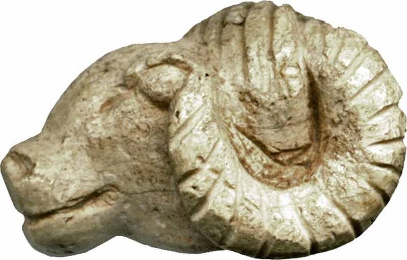 | Keywords: Near Eastern - Ram's Head - Walters 7131 - Left.jpg This tiny pendant is carved with close attention to anatomical detail The modeled eyes have long tear ducts There are ridges on the horns The hair over the forehead is indicated by stripes There are traces of red pigment on the face and under the jaw The piece is horizontally perforated through the knob placed behind the horns Pendants in the shape of rams' heads are well known in the Near East These heads differ from the familiar ram's head of the ancient Egyptian god Khnum in having horns that lie close to the head and a forelock date bone cm 0 78 1 73 1 1 accession number 71 31 26186 Henry Walters Baltimore date and mode of acquisition unknown Walters Art Museum Henry Walters Acquired by Henry Walters place of origin Near East Walters Art Museum license Ancient Near East art in the Walters Art Museum Jewellery in the Walters Art Museum Art of the ancient Near East Media contributed by the Walters Art Museum needs category review |