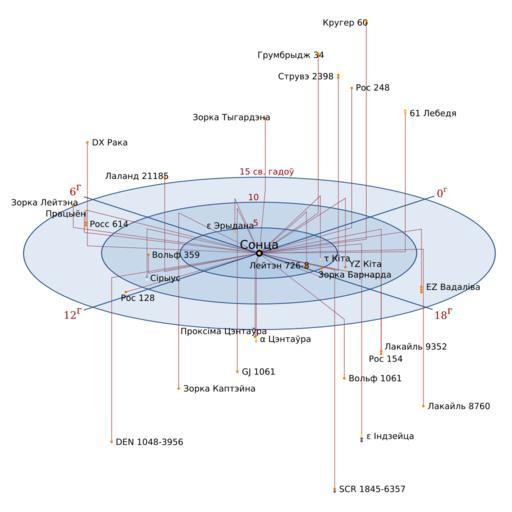 Keywords: Nearby Stars (14ly Radius)-be.svg A spatial representation of every star within 14 light-years of Sol There are 32 stars in this region including Sol The stars are coloured according to the spectral type which may not reflect the actual colour Please see this Wikipedia article for the listing of stars If a star is double or triple the stars are shown stacked vertically the actual position is the star closest to the centre plane The stars on this map may not all be visible to the naked eye as many are dwarf stars Some of this information may be preliminary and not entirely accurate as a result The coordinate system is right ascension and declination Hours of RA are marked as well as distance in multiples of 5 light-years Ка та азмяшчэння ў п асто ы ўсіх зо ных сістэм у адыусе 14 св  гадоў Сонца Уключаючы Сонца у гэтай вобласці знаходзяцца 32 зо ныя сістэмы усе яны пе алічаны ў спісе найбліжэйшых зо ак у «Вікіпедыі» Зо кі азмаляваны ў адпаведнасці з іх спект альным тыпам гэтыя коле ы могуць не супадаць з фактычнымі коле амі зо ак Падвойныя і пат ойныя зо кі азмешчаны ў выглядзе ве тыкальнай калонкі што аднак не адпавядае эальнаму становішчу зо ак у сістэме Большасць зо ак гэтай ка це не бачныя няўзб оеным вокам Частка інфа мацыі можа быць папя эдняй і не цалкам дакладнай Сістэма каа дынат заснавана на п амым узыходжанні і схіленні Вылучаны гадзіны п амога ўзыходжання і адлегласці ад Сонца к атныя 5 св  гадам Nearby_Stars_ 14ly_Radius svg 2015-01-31 Nearby_Stars_ 14ly_Radius svg Inductiveload derivative work Чаховіч Уладзіслаў <span class signature-talk >talk</span> 100px Nearby stars Original SVG English 100px Najbližje zvezde SVG slovenščina 100px айближчі зо і SVG Ук аїнська Translated into Belarusian Чаховіч Уладзіслаў Nearby_Stars_ 14ly_Radius svg Uploaded with derivativeFX Solar neighborhood Belarusian language