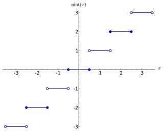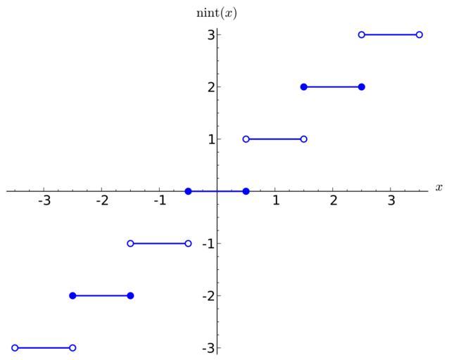 Keywords: Nearest integer.svg Created with Sage en The nearest integer round function which rounds to the nearest even integer It was generated by the following Sage code <source lang python > plot round -3 5 3 5 exclude a - 0 5 for a in range -3 5 ymax 3 zorder 3 axes_labels ' x ' r' \mathrm nint x ' fontsize 14 thickness 1 5 + point -2 5 -2 rgbcolor 'blue' pointsize 45 zorder 4 + point -1 5 -2 rgbcolor 'blue' pointsize 45 zorder 4 + point -0 5 0 rgbcolor 'blue' pointsize 45 zorder 4 + point 0 5 0 rgbcolor 'blue' pointsize 45 zorder 4 + point 1 5 2 rgbcolor 'blue' pointsize 45 zorder 4 + point 2 5 2 rgbcolor 'blue' pointsize 45 zorder 4 + point -3 5 -3 pointsize 45 zorder 4 + point -2 5 -3 pointsize 45 zorder 4 + point -1 5 -1 pointsize 45 zorder 4 + point -0 5 -1 pointsize 45 zorder 4 + point 0 5 1 pointsize 45 zorder 4 + point 1 5 1 pointsize 45 zorder 4 + point 2 5 3 pointsize 45 zorder 4 + point 3 5 3 pointsize 45 zorder 4 + point -3 5 -3 rgbcolor 'white' pointsize 20 zorder 5 + point -2 5 -3 rgbcolor 'white' pointsize 20 zorder 5 + point -1 5 -1 rgbcolor 'white' pointsize 20 zorder 5 + point -0 5 -1 rgbcolor 'white' pointsize 20 zorder 5 + point 0 5 1 rgbcolor 'white' pointsize 20 zorder 5 + point 1 5 1 rgbcolor 'white' pointsize 20 zorder 5 + point 2 5 3 rgbcolor 'white' pointsize 20 zorder 5 + point 3 5 3 rgbcolor 'white' pointsize 20 zorder 5 </source> 2012-01-05 own Eviatar Bach cc-zero Uploaded with UploadWizard Step functions Images with Sage source code Files by User InverseHypercube |