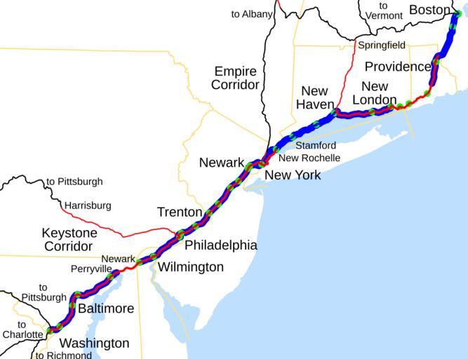 Keywords: NEC map.svg Map of the Northeast Corridor traced on USGS topos Legend Red - Amtrak ownership Blue - NEC commuter services and NEC commuter rail agency ownership Black - off-NEC Amtrak lines not owned by Amtrak Green - stations on the NEC Amtrak only User SPUI own ; USGS topographic maps 2005-10-25 spuimap Rail transport maps of the United States Amtrak maps Maps of the Pennsylvania Railroad Maps of the New York New Haven and Hartford Railroad |