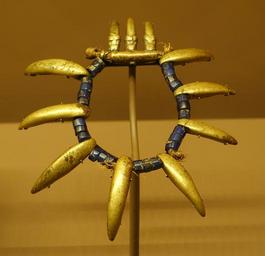 | Keywords: Necklace, Dan and Gere peoples, Libera, mid 20th century, brass, glass beads, fiber - National Museum of Natural History, United States - DSC00478.jpg en Exhibit in the National Museum of Natural History Washington DC USA Photography was permitted in the museum without restriction 2015-03-27 12 36 20 own Daderot other versions cc-zero Ethnographic items in the National Museum of Natural History USA Dan people | ||||