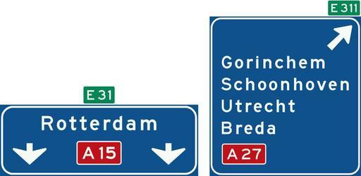 | Keywords: Nederlands verkeersbord K4.svg en Netherlands road sign K4 High level motorway information sign showing lane instructions for through traffic and exit panel showing intermediary destinations with the motorway number and European route numbers image 1 of 2 nl Nederlands verkeersbord K4 Hoge beslissingswegwijzer langs autosnelweg met rijstrookpaneel voor de doorgaande richting en aftakkingspaneel voor de afgaande richting met interlokale doelen routenummers autosnelwegen en Europese hoofdroutes afbeelding 1 van 2 http //www verkeerenwaterstaat nl/Images/Verkeersborden 20en 20regels_tcm195-170523 pdf Verkeersborden en Verkeersregels in Nederland SAMnl 2009-08-10 PD-NL-verkeersbord Diagrams of road signs of the Netherlands direction K04 |