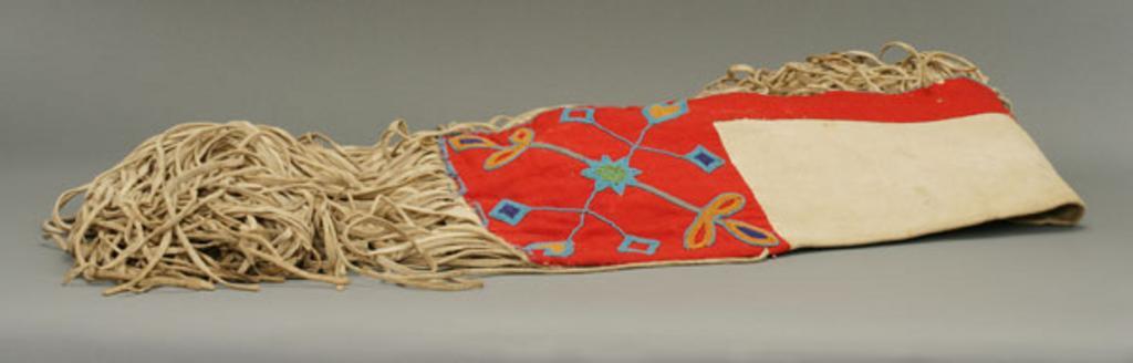 Keywords: NEPE Horse Blanket.jpg en Hose Blanket c 1875-1900 This rump drape or horse blanket is typical of Columbia Plateau horse finery It was draped over the horse behind the rider with long fringe hanging down on each side This one is made from buckskin with a red wool trade cloth background for the floral design which is executed using glass trade beads It was originally part of the Rydryck Collection Buckskin wool glass beads L 115 O W 25 0 cm Nez Perce National Historical Park NEPE 2249 Nez Perce National Historical Park NEPE 2249 Nez Perce National Historical Park 1875-1900 PD-USGov Nez Perce Horse blankets Native American beadwork Native American objects of Columbia Plateau |