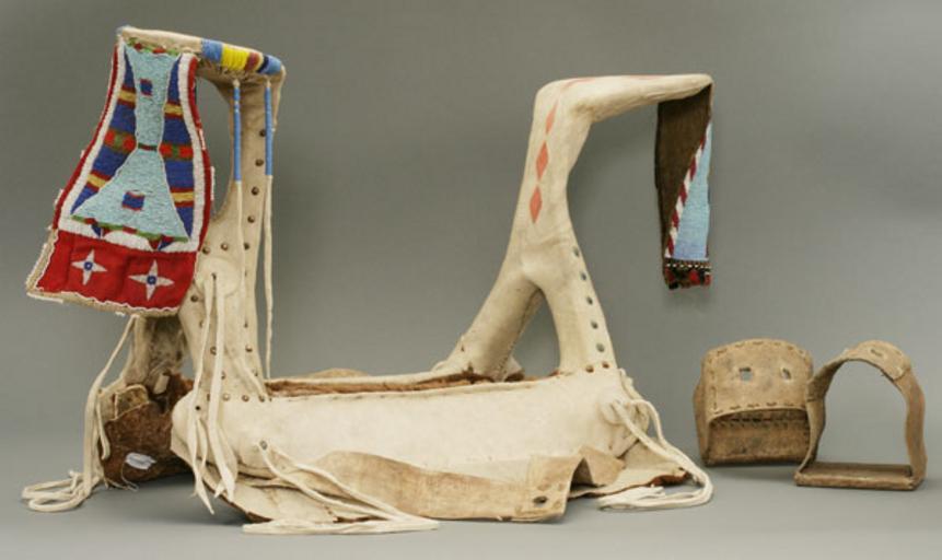 | Keywords: NEPE Saddle Woman.jpg  en Woman ™s Saddle c 1870-1880s Horses were reintroduced to North America by the Spaniards Many of the horse accoutrements such as this saddle reflect the Spanish roots of the horse The two high projections at the front and back of the saddle are reminiscent of Spanish designs The tree of this women ™s saddle is made from elk antler pieces and wood Rawhide was then stretched over the frame that in turn was covered with brain-tanned buckskin The fenders are bison hide Some of this saddle was made in the 1870s or 80s It was remade in the 1950s adding newer elements to the old The stirrups are made of rawhide with wood footholds Paint tacks wool trade cloth and glass trade beads complete the decorative elements Elk antler Cervus elaphus bison hide Bos bison buckskin H 43 4 W 30 L 72 cm Nez Perce National Historical Park NEPE 8896 Nez Perce National Historical Park NEPE 8896 Nez Perce National Historical Park 1870-1880 PD-USGov Nez Perce Saddles |