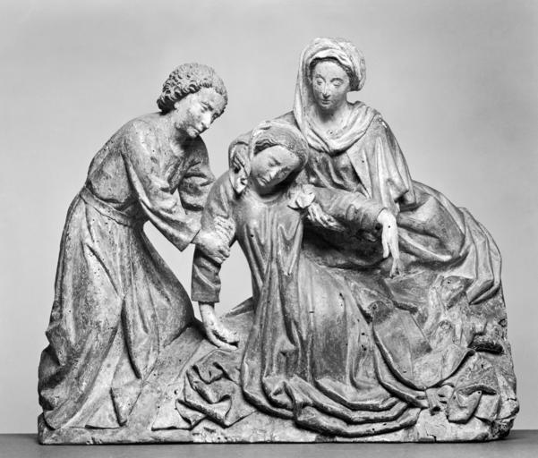 Keywords: Netherlandish - Figures from a Deposition - Walters 61147.jpg In this group from a carved altarpiece Walters 61 148 Mary swoons in a visual echo of the dead body of Christ - her suffering paralleling his suffering The figures loosely derived from the great painter Rogier van der Weyden's famous altarpiece of the Deposition of around 1442 for the Church of Our Lady Outside the Walls in Louvain in present day Belgium This piece was carved at the same time as its companion piece focused on the dead body of Christ Walters 61 148 Van der Weyden set out to imitate the three-dimensional modeling and shallow box-like space of contemporary sculpted wooden altarpieces The sculptural quality of his painted masterpiece made it in turn an especially effective model for sculptors ca 1475 Late Medieval paint on wood oak cm 32 5 39 5 11 5 accession number 61 147 4675 Arnold Seligmann Rey and Co New York Henry Walters Baltimore December 1919 by purchase Walters Art Museum Henry Walters Acquired by Henry Walters 1919 Rogier van der Weyden Musée Communal de Bruxelles Brussels 1979 Salute to Belgium place of origin Brussels Belgium Walters Art Museum license Salute to Belgium Medieval art in the Walters Art Museum Renaissance sculpture in the Walters Art Museum Art of the Netherlands Fainting Virgin Mary |