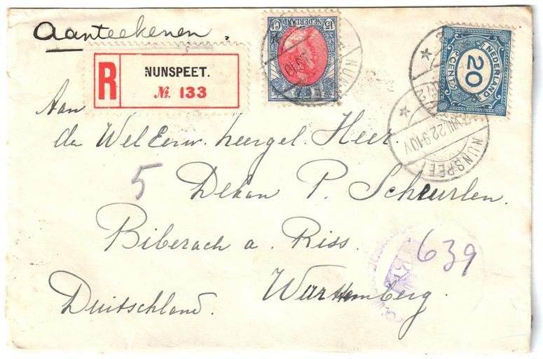 | Keywords: Netherlands 1922-08-07 cover.jpg en Netherlands 1922-08-07 cover sent registered from Nunspeet to Biberach Germany Franking of 35c with NVPH 65 and 109 Since this cover was sent registered it has been inspected by currency control authorities in Emmerich Germany circular purple postmark Sent to Dekan dean Scheurlen Paul Eugen Heinrich 25 09 1877 Königsbronn “ 13 12 1947 Biberach an der Riß Backside wax seal showing initials of sender 'HS' 1922-08-07 own scan Post of the Netherlands other versions See more images Netherlands 1922-08-07 cover jpg Netherlands 1922-08-07 cover reverse jpg LangSwitch Netherlands 1922-08-07 currency control cover to Biberach Germany Custom license marker 2016 09 11 PD-old Covers of the Netherlands 1922 Censored covers of the Netherlands Postmarks of Emmerich am Rhein Postmarks of the Netherlands Registration labels of the Netherlands |