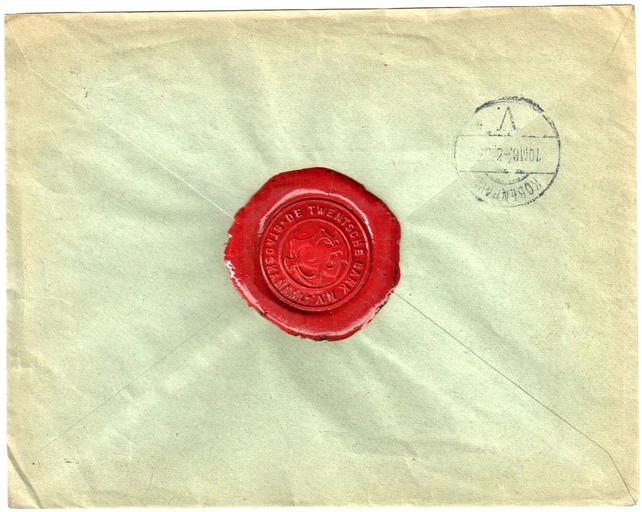 | Keywords: Netherlands 1932-10-1 money letter NVPH 193 SF reverse.jpg  en Netherlands 1932-10-1 registered money letter franked with 27 5c NVPH 193 single from Stadskanaal to Copenhagen Wax seal of 'De Twentsche Bank' backside as well as arrival Copenhagen 3-10-32 1932-10-01 own scan Post of the Netherlands other versions See more images Netherlands 1932-10-1 money letter NVPH 193 SF jpg Netherlands 1932-10-1 money letter NVPH 193 SF reverse jpg LangSwitch Netherlands 1932-1-21 registered wax sealed cover Custom license marker 2016 09 04 PD-old Sealing wax Covers of the Netherlands 1932 Twentsche Bank Postmarks of Denmark Seals of associations and organizations in the Netherlands |