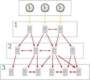 | Keywords: Network Time Protocol servers and clients.svg A diagram showing the relationships between the various levels of NTP servers The blue numbers are the stratum numbers; yellow arrows show a direct connection such as RS-232 while red arrows show a network connection Un schéma d'architecture NTP montrant les relations entre différentes strates de serveurs Les nombres en bleu représente le numéro de state ; les flèches jaunes montre les connexions directes comme du RS-232 alors que les flèches rouges montre des connexion réseau IP Based upon Ntp png by en User Kim Meyrick This version created by bdesham in Inkscape This image includes Appointment-new svg and X-directory-remote-server svg public-domain icons from the Tango project Images incorporating Tango icons Network time-related Network topology |