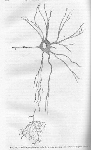 Keywords: NeuroneChauveau1890MeyCh.jpg en A neuron fr Un neurone une cellule ganglionnaire isolée de la corne antérieure de la moelle <br /> -o noyau entouré par le corps cellulaire -n prolongement cylindraxile ou de Deiters ou cylindraxe ou axone -z prolongements protoplasmiques ou dendrites qui se subdivisent en plusieurs ramifications P -P arborisation terminale <br /> ” Chauveau Auguste Arloing Saturnin Traité d'anatomie comparée des animaux domestiques <br /> 1 064 p page 760 1890 Paris Lib J B Baillière et Fils domaine public décès des auteurs 1917 et 1911 Meyer Ch 2011-03-24 PD-old Neurons Histology |