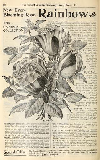 MAKE A MEME View Large Image New floral guide (16240785574).jpg 12 <br> The Conard Jones Company West Qrove Pa <br> New Ever T ˘ ' <br> Blooming Rose T\Si\t\ljO <br> THE <br> RAINBOW <br> COLLECTION J- <br> RAINBOW ” A splendid new rose The color is a lovely shade <br> ...