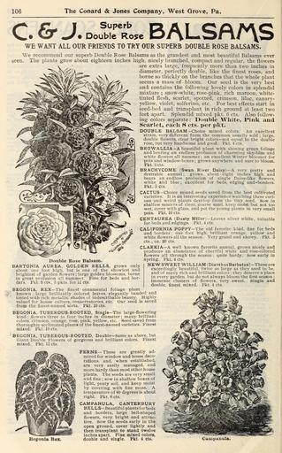 | Keywords: New floral guide (16240903464).jpg 106 <br> The Conard Jones Company West Grove Pa <br> CIT I Superb <br> ˘ W' Double Ro e <br> BALSAnS <br> WE WANT ALL OUR FRIENDS TO TRY OUR SUPERB DOUBLE ROSE BALSAMS <br> \Ve recommend our superb Double Rose Balsams as the grandest and most beautiful Balsams ever <br> seen The plants grow about eighteen inches high nicely branched compact and regular the flowers <br> are extra large frequently more than two inches in <br> diameter perfectly double like the finest roses and <br> borne so thickly on the branches that the whole plant <br> seems a mass of bloom Our seed is the very best <br> and contains the following lovely colors in splendid <br> mixture ; snow-white rose-pink rich maroon white- <br> tinted flesh scarlet spotted crimson lilac canary- <br> yellow violet solferino etc For best effects start m <br> seed-bed and transplant in rich ground at least two <br> feet apart Splendid mixed pkt 6 cts Also follow- <br> ing colors separate Double Wliite Pink aud <br> Scarlet each 8 cts per pkt <br> DOUBLE BALSAM -Choice mixed colors An excellent <br> strain very different from the common usually sold ; large <br> double flowers clear bright colors ” not equal to the double <br> rose but verv handsome and good Pkt -1 cts <br> BROWALLIA -A beautiful plant with shining green foliage <br> and bearing an endless profusion of charming sky-blue and <br> white flowers all Summer; an excellent Winter bloomer for <br> pots and window-boxes ; grows anvwhere and sure to bloom <br> Pkt 3 cts <br> BRACHYCOME Swan River Daisy ” A ver - pretty and <br> desirable annual ; grows about eight inches high and <br> bears an endless profusion of single Daisy-like flowers <br> white and blue ; excellent for beds edging and»borders <br> Pkt 3 CIS <br> CACTUS ” Choice mixed seeds saved from the best cultivated <br> varieties It is an interesting experience watching these curi- <br> ous and weird plants develop from the tiny seed Sow in <br> shallow saucers of clear coarse sand keep moist but not too <br> wet cover with glass and pot the voung plants in x vy small <br> pots Pkt 10 cts <br> CENTAUREA Dusty Miller ” Leaves silver white valuable <br> for beds and edgings Pkt 4 cts <br> CALIFORNIA POPPY ” The old favorite kind fine for beds <br> and borders one foot high brilliant orange j-ellow and <br> white flowers all the season Verj- grand and showy Pkt 3 <br> cts ; oz 30 cts <br> CLARKIA ” A well known favorite annual grows nicely and <br> produces an abundance of cheerful white and rose-colored <br> flowers all through the season ; quite hardy Sow early in <br> Spring Pkt 4 cts <br> NEW SWEET WILLIAM DianthusBarbatus ” These are <br> exceedingly beautiful twice as large as they used to be <br> and of many rich and brilliant colors ; they deser\-e a place <br> in ever - garden but do not always bloom'the first season ; <br> immense clusters of flowers very sweet Single and <br> double finest mixed Pkt 4 cts <br> Double Rose Balsam <br> BARTONIA AUREA GOLDEN BELLS grows only <br> about one foot high but is one of the showiest and <br> brightest of garden flowers ; large golden blossoms borne <br> in great profusion all Summer Fine for beds and bor- <br> ders Pkt 5 cts 3 pkts for 12 cts <br> BEGONIA REX ” The finest ornamental foliage plant <br> known ; large brilliantly colored leaves elegantly banded and <br> tinted with rich metallic'shades of indescribable beautj- _ Highly <br> valued for house culture conser\-atories etc Our seed is saved <br> from the finest-named sorts Pkt 10 cts <br> BEGONIA TUBEROUS-ROOTED Single ” The large-flowering <br> kind ; flowers three to four inches in diameter ; many brilliant <br> colors crimson orange rose pink yellow etc Seed saved from <br> thoroughlv acclimated plants of the finest-named varieties Finest <br> mixed Pkt 10 cts <br> BEGONIA TUBEROUS-ROOTED Double ” Same as above but <br> Giant Double Flowers of gorgeous and brilliant colors Finest <br> mixed Pkt 12 cts <br> FERNS ” These are greatly ad- <br> mired for window and house deco- <br> rations and when established <br> are very easily managed and <br> more hardy than most other house <br> plants The seeds are ver\' small <br> and fine ; sow in shallow boxes of <br> light peaty soil and keep moist <br> by covering with fine moss A <br> temperature of 60 degrees is about <br> right Pkt 6 cts <br> CAMPANULA CANTERBURY <br> BELLS ” Beautiful plants for beds <br> and borders large bell-shaped <br> flowers very bright and attrac- <br> tive Sow the seeds early in the <br> open ground cover lightly and <br> then transplant to stand twelve <br> inches apart Fine mixed colors <br> double and single Pkt 4 cts <br> Begosla Rejt <br> Cuiupaoula 42484268 134532 67120 Page 106 Text http //www biodiversitylibrary org/page/42484268 1901 10 1111/j 1469-7998 1865 tb02381 x Conard Jones Co West Grove Pa ; Henry G Gilbert Nursery and Seed Trade Catalog Collection NameFound Bartonia aurea NameConfirmed Bartonia aurea EOLID 6856826 NameBankID 3409117 NameFound Begonia NameConfirmed Begonia aff palmata GBG 002-089-95 EOLID 11904651 NameFound Brachycome NameConfirmed Brachycome EOLID 6264712 NameBankID 3443227 NameFound Browallia NameConfirmed Browallia L EOLID 60719 NameFound Campanula NameConfirmed Campanula subgen Campanula EOLID 24010291 NameFound Centaurea NameConfirmed Centaurea L EOLID 59386 NameFound Clarkia NameConfirmed Clarkia Pursh EOLID 38068 Biodiversity Heritage Library New floral guide 1901 Garden Stories Bulbs Plants Catalogs Nursery stock Plants Ornamental Roses Seeds U S Department of Agriculture National Agricultural Library bhl page 42484268 dc identifier http //biodiversitylibrary org/page/42484268 Conard Jones Co Flowers West Grove PA Conard Jones Co bhlGardenStories BHLinbloom bulbs plants plants ornamental u s department of agriculture national agricultural library west grove pa conard jones co bhlgardenstories bhlinbloom Information field Fli
