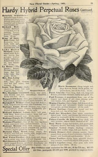 | Keywords: New floral guide (16655908717).jpg New Floral Guide Spring 1901 <br> 39 <br> Hardy Hybrid Perpetual Roses <br> Continued <br> Heinricli Schultlieis <br> Splendid large flowers very <br> double and sweet ; color <br> delicate waxy pink very <br> beautiful and a fine aut- <br> umn bloomer 15c <br> Kichard Wiil- <br> 1 a C e Brilliant <br> crimson;very <br> striking large <br> finely cupped <br> form 15 cts <br> King- of Swe- <br> den Large full <br> flowers very <br> dark rich and <br> handsome a <br> vSplendidrose 15c <br> Lady Helen <br> Stewai-t Large <br> round solid flow- <br> ers very fra- <br> grant; color <br> bright crimson <br> flamed with scar- <br> let very beauti- <br> ful 15 cts <br> La Reiiie The <br> Queen Beauti- <br> ful clear rosy pink <br> large fine full <br> form very fra- <br> grant 15 cts <br> Mrs Jno Laing- <br> Extra large <br> rich rosy pink <br> flowers <br> very full and sweet <br> bloomer 15c <br> Louis Van Houtte Dark <br> cherry-red large full and <br> fragrant fine 15 cts Margaret Dickson <br> Mrs Sharnian Crawford Deep rosy pink <br> very double and full exceedingly beautiful <br> hardy and free 20 cts <br> Marg-aret Dickson New pure white with rosy <br> flesh centre large shell-shaped petals beautiful 20c <br> Marshall P Wilder Extra large full flowers <br> dark deep red free bloomer very handsome 15c <br> Madame Annie Wood Flowers very large; <br> color brilliant violet crimson delightfully per- <br> fumed profuse bloomer 15 cts each <br> Madame Gabriel Luizet Rich soft pink <br> with deep flesh-colored centre; large full and <br> very sweet a superb rose 15 cts each <br> Madame Fannie T e Forest Pure white con- <br> stant bloomer handsome and desirable 15c <br> Madame Plantier One of the very hardiest <br> kinds pure snow-white profuse bloomer 15 cts <br> Madame Masson Fine dark crimson large <br> well-filled flowers; a most constant and profuse <br> bloomer highly prized for bedding 15 cts <br> Madame Cbas Wood Large round flat <br> flowers very full and double; rich bright crim- <br> son an immense bloomer 15 cts <br> Mad Victor Verdier Rich cherry-red chang- <br> ing to satiny rose; large full and fragrant 15c <br> Marcliioii ess of Lome Bright shining rose full <br> finely cupped flowers; produced abundantly all <br> through the season ; delightfully fragrant 15c <br> Special Offer <br> Marie Kauinami Deep bright red <br> large flowers broad thick petals ex- <br> quisite form one of the best 15 cts <br> Prest Lincoln Very deep dark red large full <br> flowers ; abundant bloomer; hardy and good 15c <br> Paul Jfeyron- A magnificent Rose one of the <br> largest and finest of all; clear shinmg pink; <br> very double full and fragrant 15 cts <br> Mag-na Cliarta Extra large full flowers of un- <br> usual depth and substance; bright rosy-pink; <br> very grand profuse bloomer 15 cts each <br> Pierre Notting-- Grand size round and full; <br> deep dark red one of the best 15 cts <br> Perle des Blanches Pure white sometimes <br> tinted pink Early and blooms the whole season <br> almost as constantly as the ever-bloomers 15c <br> Prince Camille de Kohan Very dark vel- <br> vety crimson almost black; darkest of all 15c <br> liosy Morn Large full flowers rich peach pink <br> elegently shaded fine buds very beautiful 15c <br> Senator Vaisse Bright flashing crimson <br> flamed with scarlet; large full and double 15c <br> Ulricli Bruner Rich crimson scarlet broad <br> round thick petals of good substance highly per- <br> fumed very handsome and desirable 15 cts <br> Victor Verdier Extra large splendid flowers <br> rosy carmine beautifully edged with purple 15c <br> Vick'S Caprice Deep clear pink with wide <br> stripes of pure white 20 cts <br> Any 4 fifteen-ceut varieties for 50 cts O for 75 cts 1 25 <br> per doz postpaid; 9 00 per 100 packed to express here 42484201 134532 67120 Page 39 Text http //www biodiversitylibrary org/page/42484201 1901 10 1111/j 1469-7998 1865 tb02381 x Conard Jones Co West Grove Pa ; Henry G Gilbert Nursery and Seed Trade Catalog Collection NameFound Jno NameConfirmed Jno NameBankID 3009333 Biodiversity Heritage Library New floral guide 1901 Garden Stories Bulbs Plants Catalogs Nursery stock Plants Ornamental Roses Seeds U S Department of Agriculture National Agricultural Library bhl page 42484201 dc identifier http //biodiversitylibrary org/page/42484201 Conard Jones Co Flowers West Grove PA Conard Jones Co bhlGardenStories BHLinbloom bulbs plants plants ornamental u s department of agriculture national agricultural library west grove pa conard jones co bhlgardenstories bhlinbloom Information field Flickr posted date ISOdate 2015-03-19 Check categories 2015 August 23 CC-BY-2 0 BioDivLibrary https //flickr com/photos/61021753 N02/16655908717 2015-08-23 23 58 02 cc-by-2 0 PD-old-70-1923 New floral guide 1901 Photos uploaded from Flickr by Fæ using a script |