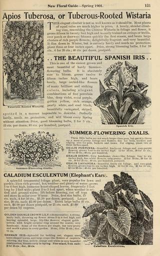 | Keywords: New floral guide (16675697198).jpg New Floral Guide Spring 1901 <br> 121 <br> Apios Tubcrosa or Tuberous-Rooted Wistaria <br> THIS elegaut climber is not as well known as it should be Most plants <br> of equal value are much higher in price - A lovely slender climb- <br> ing vine resembling the Chinese Wistaria in foliage and flower it <br> grows fifteen to twenty feet high and is easily trained on strings or trellis <br> over porch or doorway; blooms quickly the first season and bears large <br> clustersof rich purple flowers; delightfully fragrant and very beautiful <br> It dies down in Winter but is entirely hardy and needs no protection ; <br> plant three or four inches apart Price strong blooming bulbs 3 for 10 <br> cts 6 for 20 cts ; 40 cts per dozen postpaid <br> THE BEAUTIFUlTsPANISH IRIS <br> This is one of the easiest grown and <br> most beautiful of hardy Summer- <br> flowering bulbs It is absolutely <br> sure to bloom; grows twelve to <br> fifteen inches high and bears <br> lovely large orchid-like flowers <br> of many brilliant and striking <br> colors including elegant <br> combinations of fine porcelain <br> blue deep violet royal purple <br> golden yellow rich orange <br> pearly white and coal black <br> beautifully variegated striped <br> spotted in a manner impossible to describe Perfectly <br> hardy needs no protection and will bloom every Spring <br> without attention Price good blooming bulbs 3 for 5 cts <br> 15 cts per dozen; 85 cts per hundred postpaid <br> Tuberous Rooted Wistaria <br> Spanish Iris <br> Summer-iriowering Oxalis <br> SUMMER-FLOWERING OXALIS <br> These little bul bs are not much larger than peas but quickly throw <br> up a mass of pretty foliage and flowers; fine for beds borders and <br> edging; also for pots baskets and vases For edging plant two or <br> three inches apart <br> OXALIS PURPUREA Beautiful finely-cut foliage and rosy-purple <br> flowers; grows four to six inches high 12 for 10 cts 20 for 15 cts <br> 50 for 25 cts ; 40 cts per hundred <br> OXALIS DIEPPI Very handsome clover-like foliage four to six <br> inches high; fine white flowers very pretty 12 for 10 cts 20 for 15 <br> cts 50 for 25 cts ; 40 cts per hundred postpaid <br> OXALIS LASIANDRA Beautiful finely cut foliage and rosy-pink <br> flowers; grows four to six inches high 12 for 10 cts 20 for 15 cts <br> 50 for 25 cts ; 40 cts per hundred <br> CALADIUM ESCULENTUM Elephant's Ears <br> A splendid ornamental foliage plant very popular for lawn and <br> garden; likes rich groimd hot weather and plenty of water; grows <br> 3 to 4 feet high immense heart-shaped leaves frequently 3 feet <br> long by 2 feet wide; plant 2 to 3 feet apart when weather is set- <br> tled and ground w arm; lift before freezing cut off tops <br> and store in cellar over Winter Price first size bulbs 15 <br> cts each 4 for 50 cts 1 50 per dozen postpaid Larger <br> size 20 cts each; 2 00 per dozen Extra large bulbs 40 cts <br> each 4 00 per dozen postpaid or 25 cts each 3 00 <br> per dozen by express <br> GOLDEN DOUBLE CROWN LILY- Hemerocallis A strong <br> hardy bulb throwing up flower stems 3 to 4 feet high and <br> bearing splendid large lily-like flowers; elegant golde <br> yellow with bright carmine ring around the centre; very <br> handsome Some of the flowers are single but very pretty <br> and worth a place in every garden 10 cts ; 3 for 25 cts ; doz <br> 75 cts <br> GERMAN IRIS Splendid for bedding out; elegant erect j <br> lance-shaped leaves and large crape-like flowers of exquisite <br> coloring sky blue yellow orange and white in very beautiful <br> combination; blooms early in Spring Fine mixed 6 cts each ; <br> 8 for 15 cts ; doz 50 cts <br> Caladium Esculentum 42484283 134532 67120 Page 121 Text http //www biodiversitylibrary org/page/42484283 1901 10 1111/j 1469-7998 1865 tb02381 x Conard Jones Co West Grove Pa ; Henry G Gilbert Nursery and Seed Trade Catalog Collection NameFound Apios NameConfirmed Apios EOLID 28882 NameBankID 2650415 NameFound Caladium NameConfirmed Caladium Vent EOLID 29219 NameFound Caladium esculentum NameConfirmed Caladium esculentum L Vent EOLID 1091931 NameBankID 5875357 NameFound Oxalis NameConfirmed Oxalis sect Pseudobulbosae Norlind EOLID 40270 NameFound Oxalis lasiandra NameConfirmed Oxalis lasiandra Zucc EOLID 5021208 NameFound Oxalis purpurea NameConfirmed Oxalis purpurea EOLID 592337 NameBankID 2652460 NameFound Wistaria NameConfirmed Wistaria NameBankID 8859180 Biodiversity Heritage Library New floral guide 1901 Garden Stories Bulbs Plants Catalogs Nursery stock Plants Ornamental Roses Seeds U S Department of Agriculture National Agricultural Library bhl page 42484283 dc identifier http //biodiversitylibrary org/page/42484283 Conard Jones Co Flowers West Grove PA Conard Jones Co bhlGardenStories BHLinbloom bulbs plants plants ornamental u s department of agriculture national agricultural library west grove pa conard jones co bhlgardenstories bhlinbloom Information field Flickr posted date ISOdate 2015-03-19 Check categories 2015 August 23 CC-BY-2 0 BioDivLibrary https //flickr com/photos/61021753 N02/16675697198 2015-08-23 23 55 49 cc-by-2 0 PD-old-70-1923 New floral guide 1901 Photos uploaded from Flickr by FĂŚ using a script |