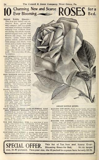 | Keywords: New floral guide (16837301406).jpg  24 <br> The Conard Jones Company West Grove Pa <br> i \ Charming New and Scarce <br> \\J Ever Blooming <br> Sweet Little Queen  <br> This is a very dainty and at- <br> tractive Rose grows neat <br> and compact and is a quick <br> and most abundant bloomer <br> scarcely ever without flow- <br> ers during the whole season <br> makes elegant buds and the <br> flowers are large full and <br> double Color bright rich <br> golden yellow centre shaded <br> with orange and blush very <br> sweet and a really charming <br> rose sure to please every <br> one Price 20 cts each; <br> larger size 25 cts each post- <br> paid Two-year size 40 cts <br> by express <br> THE JEWELL  A most novel and <br> charming variety bearing dif- <br> ferent colored flowers varN'ing <br> from deep orange yellow to crim- <br> son and variegated shades It is <br> a true ever-blooming rose de- <br> lightfully scented does well in <br> open ground and is quite hardy <br> and an abundant bloomer Strong <br> plants 15 cts ; larger size 20 cts <br> Two-j'ear size 35 cts by express <br> MAD EUGENIE BOULET-New <br> European Rose; magnificent flow- <br> ers and buds; extra large fine <br> cup form well filled and delight- <br> fully fragrant; color; fine buff <br> pink shading to yellow and rich <br> carmine Verv handsome 10 cts ; <br> larger size 15 cts Two-year size <br> 30 cts by express <br> PEARL RIVERS-This beautiful <br> Rose is the result of a cross be- <br> tween Devoniensis the Magnolia <br> Rose and Madame de Watteville <br> The flowers are large and full <br> with peachy-red buds; the pre- <br> vailing color is ivorj' white petals <br> delicately shaded and bordered <br> with pale rose; very beautiful <br> and deliciously sweet 10 cts ; <br> larger size 15 cts Two-year size <br> 30 cts by express <br> NEW HARDY CRIMSON EVER BLOOMING ROSE <br> MRS PIERPONT MORGAN  This is a wonderfully <br> beautiful Rose - in every way The flowers are large and <br> very double with broad massive petals and delightfully <br> perfumed color pure bright cherry red very rich and <br> beautiful; a constant bloomer ; and very hardy strong <br> plants 20 cts ; larger size 25 cts ; postpaid Two-year <br> size 40 cts by express <br> THE RED MARECHAL NIEL is a new Rose of great <br> beauty very similar to the well-known Yellow Marechal <br> Niel except in color which is bright rosy red Both <br> flowers and buds are large and beautifully formed and <br> delightfully sweet scented Strong plants 15 cts ; larger <br> size 20 cts postpaid Two-year size 35 cts each express <br> COMTESSE LILY KINSKY  A strong vigorous grower <br> bearing large full flowers of fine regular form; color <br> white delicately tinged with blush chamois yellow <br> centre ; very sweet and pretty 15 cts each ; larger size <br> 20 cts Two-year size 35 cts by express <br> <br> ROSES <br> for a <br> Bed <br> SWEET lilTTLE QUEET <br> MADAME VON BOCH  Plant strong bushy and always <br> blooming from June till November Flowers large and <br> well filled opens freely; buds very large on strong stems <br> color creamy-yellow with carmine shading very fragrant <br> and highly recommended both for bedding and house <br> culture Price 15 cts each; larger size 20 cts postpaid <br> Two-year size 35 cts by express <br> MADAME VON SIEMENS-A handsome and valuable <br> variety; large full Roses of perfect form fine rosy flesh <br> colored beautifully shaded and very sweet a constant and <br> abundant bloomer ; quite hardy and fine for bedding <br> 15 cts each; larger size 20 cts postpaid Two-year size <br> 35 cts by express <br> REICHSGRAF VON KESSELSTATT  Flowers extra large <br> and quite full petals broad and nicely arched ; color <br> brilliant carmine passing to rose pink on pure white <br> ground; petals edged with rich crimson ver\' fragrant <br> The bush is a handsome erect grower and abundant <br> bloomer 10 cts each; larger size 15 cts <br> PFTTAT OPPPP Scarce Ever <br> i EljlilJL VyirClx Blooming Roses for Bed 1 15; larger <br> size 1 50 postpaid Two-year size the 10 packed to express here for only 2 75 i 42484186 134532 67120 Page 24 Text http //www biodiversitylibrary org/page/42484186 1901 10 1111/j 1469-7998 1865 tb02381 x Conard Jones Co West Grove Pa ; Henry G Gilbert Nursery and Seed Trade Catalog Collection NameFound Magnolia NameConfirmed Magnolia sect Splendentes Dandy ex J A Vazquez G EOLID 44478 Biodiversity Heritage Library New floral guide 1901 Garden Stories Bulbs Plants Catalogs Nursery stock Plants Ornamental Roses Seeds U S Department of Agriculture National Agricultural Library bhl page 42484186 dc identifier http //biodiversitylibrary org/page/42484186 Conard Jones Co Flowers West Grove PA Conard Jones Co bhlGardenStories BHLinbloom bulbs plants plants ornamental u s department of agriculture national agricultural library west grove pa conard jones co bhlgardenstories bhlinbloom Information field Flickr posted date ISOdate 2015-03-19 Check categories 2015 August 23 CC-BY-2 0 BioDivLibrary https //flickr com/photos/61021753 N02/16837301406 2015-08-23 23 54 55 cc-by-2 0 PD-old-70-1923 New floral guide 1901 Photos uploaded from Flickr by FĂŚ using a script |