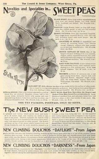| Keywords: New floral guide (16837384896).jpg 100 <br> The Conard Jones Company West Qrove Pa <br> \JoveIties and Specialties i <br> SWEET PEAS <br> STELLA MORSE This is the nearest approach to a j ellow <br> Sweet Pea yet obtained Exquisite creamy buflf or rich <br> creamy white delicately tinted with canary and rose <br> Splendid large flowers borne three and four on a stem ; one <br> of the most beautiful of all Pkt 50 seeds 4 cts ; oz 10 cts <br> BLACK NIGHT Extra large widely expanded flowers <br> deep wine red shaded purple ver - dark almost <br> black handsome and distinct Pkt 50 seeds 4 cts ; <br> oz 10 cts <br> FASHION Large flowers borne on long stiff stems <br> color fine reddish purple ; a very rare and beautiful <br> shade Pkt 50 seeds 4 cts ; oz 10 cts <br> QUEEN VICTORIA New and exquisitely beautiful <br> extra large finely expanded flowers color soft rosy <br> buff delicatel5' tinted with violet purple Pkt 50 <br> seeds 4 cts ; oz 10 cts <br> COUNTESS OF POWIS-A magnificent new <br> variety of charming beauty color lustrous <br> g orange elegantly suffused with light purple <br> a very rare and beautiful color Pkt 50 seeds <br> 4 cts ; oz 10 cts <br> PRINCE EDWARD OF YORK One of the <br> largest and most striking of the new varieties <br> elegant widely expanded blossoms fine pink- <br> ish scarlet with large wings of c\ei r bright rose <br> very bold and attractive Pkt 50 seeds 4 cts ; <br> oz 10 cts <br> LADY NINA BALFOUR A new variety of rare <br> and captivating beauty color exquisite mauve <br> shading to a rich pinkish gray ; of the most <br> refined elegance Pkt 50 seeds 4 cts ; oz <br> 10 cts <br> TRIUMPH A flower of enormous size a real <br> giant among Sweet Peas Superb bold well <br> expanded flowers Exquisite bright orange <br> pink the wings white slightly tinted with <br> violet-purple very sweet Pkt 50 seeds 4 cts ; <br> oz 10 cts <br> EARLIEST OF ALL Blooms ten days or two weeks before the earliest of other kinds ; <br> has no equal for forcing under glass for cut flowers Low bushy growers great bloomer ; <br> deep rose shading to white very fresh and beautiful Pkt 40 seeds 4 cts ; oz 15 cts <br> NAVY BLUE Real True Navy Blue the deepest and <br> darkest True Blue Sweet Pea yet introduced Large <br> flowers of excellent form and substance borne three and <br> four on a stem ; a first class novelty of rare merit Pkt <br> 30 seeds 4 cts ; oz 15 cts <br> THE TE S PACKETS POSTPAID ONLY 35 CENTS <br> Tbe NEW BUSH 5WEET PEA <br> A splendid new varietj which grows stout and bushy <br> 12 to 16 inches high and requires no trellis or sup- <br> port of any kind Flowers resemble the famous Gray <br> Friar one of the most beautiful of the newer Sweet Peas ; <br> color rich watered purple on white ground The flowers <br> are borne on top of the plants which branch f reelj and <br> bloom abundantly and the seeds should be planted so as <br> to make a close even hedge-like row As this beautiful <br> new variety requires no trellis or support it can be grown <br> everywhere with other flowers Scarcely any flowers are <br> easier to grow or more highly valued than sweet peas and <br> all lovers of choice new flowers should give the New Bush <br> Sweet Pea a liberal trial this season Price per pkt 20 <br> seeds 5 cts ; oz 15 cts <br> NEW CLIMBING DOLICHOS DAYLIGHT --From Japan <br> Every one who has seen this beautiful Climbing Dolichos in full bloom must admit that it is one of the prettiest annual <br> climbers they ever saw It does well trained to a post or trellis 8 to 10 feet high and literally covers itself with lovely <br> snow white pea-like flowers ; it continues to bloom until killed down by hard frost The flowers are followed by large <br> creamy-white pods having a rich waxen appearance which adds to the beauty of the vine It is really a charming <br> climber blooms quickly and can be depended on to give immense satisfaction to all Price per pkt 8 cts <br> NEW CLIMBING DOLICHOS DARKNESS -From Japan <br> This is a most fitting companion for the Daylight described above As the flowers are of a dark violet color and borne <br> in large clusters followed by pretty crimson seed pods most people will want both varieties as they contrast finely <br> together and are among the most beautiful annual climbers we have Pkt 8 cts The two varieties for 15 cts 42484262 134532 67120 Page 100 Text http //www biodiversitylibrary org/page/42484262 1901 10 1111/j 1469-7998 1865 tb02381 x Conard Jones Co West Grove Pa ; Henry G Gilbert Nursery and Seed Trade Catalog Collection NameFound Dolichos NameConfirmed Dolichos EOLID 28202 NameBankID 277075 NameFound Nina NameConfirmed Nina NameBankID 3002505 Biodiversity Heritage Library New floral guide 1901 Garden Stories Bulbs Plants Catalogs Nursery stock Plants Ornamental Roses Seeds U S Department of Agriculture National Agricultural Library bhl page 42484262 dc identifier http //biodiversitylibrary org/page/42484262 Conard Jones Co Flowers West Grove PA Conard Jones Co bhlGardenStories BHLinbloom bulbs plants plants ornamental u s department of agriculture national agricultural library west grove pa conard jones co bhlgardenstories bhlinbloom Information field Flickr posted date ISOdate 2015-03-19 Check categories 2015 August 23 CC-BY-2 0 BioDivLibrary https //flickr com/photos/61021753 N02/16837384896 2015-08-23 23 52 08 cc-by-2 0 PD-old-70-1923 New floral guide 1901 Photos uploaded from Flickr by FĂŚ using a script |