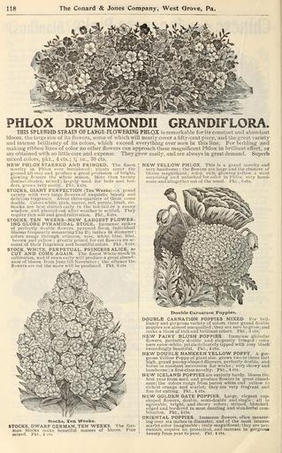 | Keywords: New floral guide (16837422136).jpg  118 <br> The Conard Jones Company West Grove Pa <br> PHLOX DRUMMONDII GRANDIFLORA <br> THIS SPLENDID STRAIN OF LARGE-FLOWERING PHLOX is remarkable for its constant and abundant <br> bloom the large size of its flowers some of which will nearh cover a fift '-cent piece and the great variety <br> and intense brilliancy of its colors which exceed everything ever seen in this line For bedding and <br> making ribbon lines of color no other flowers can approach these magnificent Phlox in brilliant effect or <br> are obtained with so little care and expense They grow easily and are always in great demand Superb <br> mixed colors pkt 4 cts ; oz 30 cts <br> NEW PHLOX STARRED AND FRINGED The finest <br> novelty in Phlox ever introduced ; plants cover _ the <br> ground all over and produce a great profusion of bright <br> glowing flowers the whole season ISIore than twenty <br> distinct shades mixed; largely used for beds and bor- <br> ders grows ver;v' easilj- Pkt 4 cts <br> STOCKS GIANT PERFECTION Ten Weeks -A grand <br> variety with ver\' large flowers of exquisite beauty and <br> delicious fragrance About three-quarters of them come <br> dovible Colors white pink mauve red purple blush etc <br> Stocks are best started earlv in the hot-bed or a sunny <br> window and planted out after weather is settled They <br> require rich soil and good cultivation Pkt 6 cts <br> STOCKS TEN WEEKS ” NEW LARGEST FLOWER- <br> ING GLOBE PYRAMIDAL STOCK Immense spikes <br> of perfectly double flowers pyramid form individual <br> blooms frequenth' measuring2 to 2 2 inches in diameter ; <br> colors range through crimson rose white blue lilac <br> brown and yellow ; greatly prized for cut flowers on ac- <br> count of their fragrance and beautiful colors Pkt Gets <br> STOCK WHITE PERPETUAL PRINCESS ALICE or <br> CUT AND COME AGAIN The finest White Stock in <br> cultivation and if sown early will produce a great abund- <br> ance of bloom from June till November ; the oftener the <br> flowers are cut the more will be produced Pkt 6 cts <br> NEW YELLOW PHLOX This is a grand novelty and <br> ver\' handsome ; the flowers are large and the clu sters of <br> bloom magnificent; color rich glowing 3-ellow a most <br> surprising and unlocked for color in Phlox very hand- <br> some and altogether out of the usual Pkt 3 cts <br> Stocks Ten Weeks <br> STOCKS DWARF GERMAN TEN WEEKS The Ger- <br> man Stocks make beautiful masses of bloom Fine <br> mixed Pkt 4 cts <br> Double Carnation Poppies <br> DOUBLE CARNATION POPPIES MIXED For bril- <br> liancy and gorgeous variety of colors these grand double <br> poppies are almost unequalled ; the ' are sure to grow and <br> make a blaze of rich and brilliant colors Pkt o cts <br> NEW FAIRY BLUSH POPPIES Immense globular <br> flowers perfectly double and elegantly fringed ; color <br> pure snow-white 'petals delicately tipped with rosy blush <br> exceedingly beautiful Pkt 4 cts <br> NEW DOUBLE NANKEEN YELLOW POPPY A gor- <br> geous Yellow Poppy of giant size grows two to three feet <br> high grand peeony -shaped fllowers perfectl double and <br> borne in constant succession for weeks ; very showy and <br> handsome ; a first-class novelty Pkt 4 cts <br> NEW ICELAND POPPIES are entirely hardy bloom the <br> first year from seed and produce flowers in great abund- <br> ance;'the colors range from purest white and 5-ellow to <br> richest orange and scarlet; they are very fragrant and <br> fine for cutting Pkt 4 cts <br> NEW GOLDEN GATE POPPIES I arge elegant cup- <br> shaped flowers double semi-double and single ; all in <br> agreeable bright and showy colors ; striped blotched <br> edged and bordered in most dazzling and wonderful com- <br> bination Pkt 4 cts <br> ORIENTAL POPPIES Immense flowers often measur- <br> ing over six inches in diameter and of the most intense <br> scarlet color imaginable ; truly magnificent; they are per- <br> ennials require no protection and increase in gorgeous <br> beauty from year to year Pkt 4 cts 42484280 134532 67120 Page 118 Text http //www biodiversitylibrary org/page/42484280 1901 10 1111/j 1469-7998 1865 tb02381 x Conard Jones Co West Grove Pa ; Henry G Gilbert Nursery and Seed Trade Catalog Collection NameFound Phlox NameConfirmed Phlox L EOLID 40661 NameFound Phlox drummondii NameConfirmed Phlox drummondii EOLID 580874 NameBankID 2653908 Biodiversity Heritage Library New floral guide 1901 Garden Stories Bulbs Plants Catalogs Nursery stock Plants Ornamental Roses Seeds U S Department of Agriculture National Agricultural Library bhl page 42484280 dc identifier http //biodiversitylibrary org/page/42484280 Conard Jones Co Flowers West Grove PA Conard Jones Co bhlGardenStories BHLinbloom bulbs plants plants ornamental u s department of agriculture national agricultural library west grove pa conard jones co bhlgardenstories bhlinbloom Information field Flickr posted date ISOdate 2015-03-19 Check categories 2015 August 23 CC-BY-2 0 BioDivLibrary https //flickr com/photos/61021753 N02/16837422136 2015-08-23 23 51 22 cc-by-2 0 PD-old-70-1923 New floral guide 1901 Photos uploaded from Flickr by Fæ using a script |