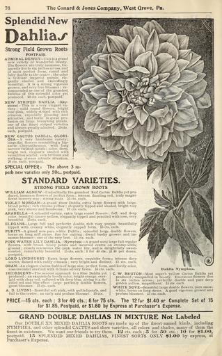 | Keywords: New floral guide (16862077522).jpg 76 <br> The Conard Jones Company West Qrove Pa <br> Splendid New <br> Dahlias <br> strong Field Grown Roots <br> POSTPAID <br> ADMIRAL DEWEY This is a grand <br> new varietj' of wonderful beauty <br> The flowers are truh immense fre- <br> quently five to six inches across and <br> of most perfect form round and <br> fully double to the centre ; the color <br> is brilliant imperial purple ele- <br> gantly shaded and exceedingly <br> beautiful It is a strong vigorous <br> grower and ver\' free bloomer ; re- <br> commended as one of the grandest <br> Dahlias of this splendid color yet <br> produced 20 cts each postpaid <br> NEW STRIPED DAHLIA Key- <br> stone This is a very elegant va- <br> riety ; solid round flowers bright <br> rose pink widely striped with rich <br> crimson especialh' pleasing and <br> attractive and borne in great pro- <br> fusion on large branching plants <br> one of the finest striped varieties <br> and always greatly admired 20 cts <br> each postpaid <br> NEW CACTUS DAHLIA GLORI- <br> OSA A verj' handsome variety; <br> large flat flowers resembling a Jap- <br> anese Chr -anthemum with long <br> narrow twisted petals ; color deep <br> bright red elegantly shaded with <br> Vermillion scarlet; ve'r\- brilliant and <br> striking; always attracts attention <br> 20 cts each postpaid <br> SPECIAL OFFER The above 3 su <br> perb new varieties only 50c postpaid <br> STANDARD VARIETIES <br> STRONG FIELD GROWN ROOTS <br> WILLIAM AGNEW Undoubtedly the grandest Red Cactus Dahlia yet pro- <br> duced immense flowers of perfect form ; intense dazzling red truly magni- <br> ficent in ever - way ; strong roots 15 cts each <br> VIOLET MORGAN A grand show Dahlia extra large flowers with large <br> broad petals ; rich chrome j-ellow ; eleganth- tipped and shaded bright rosy <br> pink verj' show - and handsome 1 5 cts each <br> ARABELLA- A splendid variety extra large round flowers ; full and deep <br> color beautiful canary j'ellow elegantly tipped and penciled with rose very <br> beautiful 15 cts each <br> ELEGANS Large full and perfectly double rich rosy purple beautifully <br> tipped with creamy white elegantly cupped form 15 cts each <br> PURITY A grand new pure white Dahlia; splendid large double flowers <br> borne on long stiff stems fine for cutting ; dwarf bushy grower and im- <br> mense bloomer ; one of the very best 15 cts each <br> PINK WATER LILY DAHLIA Nymphea A grand sort; large full regular <br> flowers with broad heaw petals and incurved centre on creamy-white <br> ground ; closely resembles the pink water lih and is delightfully sweet- <br> scented ; remarkabl beautiful 15 cts each ; 3 for 40 cts ; 1 40 per dozen <br> postpaid <br> LORD LYNDHURST Extra large flowers exquisite form ; intense fiery <br> scarlet flamed with ruddy crimson ; very bright and distinct 15 cts each <br> OBAN An elegant Cactus Dahlia of large size perfect form and lovely color <br> rose-lavender overlaid with delicate silvery fawn 15 cts each <br> IRIDESCENT The nearest approach to a Blue Dahlia yet <br> produced ; an exquisitely lovely color bright orange over- <br> paid with clear red sufTused with deep blue giving it a de- <br> cided red and blvie effect ; large perfectly double flowers <br> great bloomer 15 cts each <br> A D LIVONI Beautiful soft pink with quilled petals and <br> full to the centre ; an early and profuse bloomer 15 cts <br> Dahlia Nymphea <br> C W BRUTON Most superb yellow Cactus Dahlia yet <br> produced ; unequalled in beauty Enormous flowers five <br> to six inches across ; perfectU' double and pure deep <br> golden yellow magnificent 15 cts each <br> W HITE DOVE Beautiful large double flowers pure snow- <br> white borne on long stems A good vigorous grower and <br> profuse bloomer 15 cts each <br> PRICE 15 cts each ; 3 for 40 cts ; 6 for 75 cts The 12 for 1 40 or Complete Set of 15 <br> for 1 85 Postpaid or 1 60 by Express at Pu-i-chaser's Expense <br> GRAND DOUBLE DAHLIAS IN MIXTURE Not Labeled <br> Our DOUBLE XX MIXED DAHLIA ROOTS are made up of the finest named kinds including <br> NYMPHEA and other splendid CACTUS and show varieties all colors and shades many of them the <br> finest in existence We want our friends to try them 12 cts each ; 5 for 50 cts ; 10 for 1 00 <br> postpaid 15 SPLENDID MIXED DAHLIAS FINEST SORTS ONLY 1 00 by express at <br> Purchaser's Expense 42484238 134532 67120 Page 76 Text http //www biodiversitylibrary org/page/42484238 1901 10 1111/j 1469-7998 1865 tb02381 x Conard Jones Co West Grove Pa ; Henry G Gilbert Nursery and Seed Trade Catalog Collection NameFound Elegans NameConfirmed Elegans NameBankID 5116399 NameFound Nymphea NameConfirmed Nymphea EOLID 60384 NameBankID 8918755 Biodiversity Heritage Library New floral guide 1901 Garden Stories Bulbs Plants Catalogs Nursery stock Plants Ornamental Roses Seeds U S Department of Agriculture National Agricultural Library bhl page 42484238 dc identifier http //biodiversitylibrary org/page/42484238 Conard Jones Co Flowers West Grove PA Conard Jones Co bhlGardenStories BHLinbloom bulbs plants plants ornamental u s department of agriculture national agricultural library west grove pa conard jones co bhlgardenstories bhlinbloom Information field Flickr posted date ISOdate 2015-03-19 Check categories 2015 August 23 CC-BY-2 0 BioDivLibrary https //flickr com/photos/61021753 N02/16862077522 2015-08-23 23 55 34 cc-by-2 0 PD-old-70-1923 New floral guide 1901 Photos uploaded from Flickr by FĂŚ using a script |