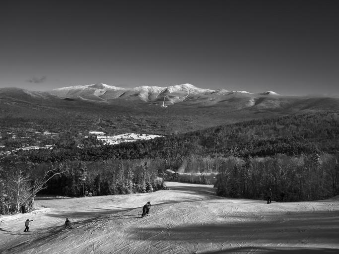 Keywords: new hampshire mountains landscape scenic skiers skiing slope forest trees winter snow outside countryside black and white