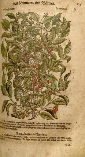 Keywords: New Kreüterbuch (8341603865).jpg ßo« Rmttm/ m <br> pin cl itttttt <br> / <br> Euonymusl <br> A <br> <br> B <br> fSi <br> – « f'-rtliubtmbjr große <br> L <br> '»» tnigwrtt» Kern/ cttltrJJr f/ s ' <br> CttVttß <br> mm gcS ' ' ' ' ««Ucmfc w rg/bcyte wwer 4 f«3/ <br> « <br> S Sfföi <br> amr/j raffr/üttb mutimg <br> 'ogct jjt/ <br> V wj«« cr öiefS crt »criwnew wmi9 Die herbat wt <br> berbert <br> faxe <br> <br> ica <br> \ <br> + 9500232 37059 9009 Page 83 Text http //www biodiversitylibrary org/page/9500232 1563 10 5962/bhl title 9009 Georgen Melantrich von Auentin ; Handsch Georg H ; Mattioli Pietro Andrea; Vincenti Valgriss Buchdruckers Biodiversity Heritage Library New Kreüterbuch Botany Medical De materia medica Dioscorides Pedanius Early works to 1800 Materia medica of Anazarbos Pharmacognosy Missouri Botanical Garden Peter H Raven Library bhl page 9500232 dc identifier http //biodiversitylibrary org/page/9500232 botany medical dioscorides pedanius of anazarbos missouri botanical garden peter h raven library Information field Flickr posted date ISOdate 2013-01-03 Check categories 2015 August 29 CC-BY-2 0 BioDivLibrary https //flickr com/photos/61021753 N02/8341603865 2015-08-29 02 57 07 cc-by-2 0 PD-old-70-1923 New Kreüterbuch 1563 Photos uploaded from Flickr by Fæ using a script |